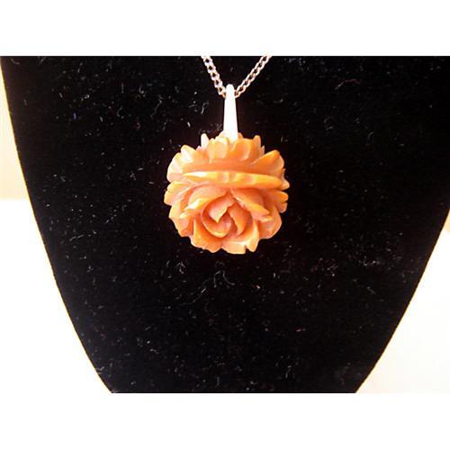 BEAUTIFULLY CARVED BAKELITE FLOWER PENDANT WITH CHAIN...BOOK PIECE, CLASSIC ELEGANCE.</em></td>