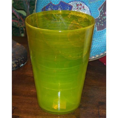 This is a fabulous tall vase of canary yellow glass. It is hand blown and has a bubble and a slightly rippled feel as you run your hands up the sides of the vase. It has a broken pontil. No marks as to maker, but it may be an old Blenko piece. The vase is 7.25" tall. The opening is 5.25" and the base is 3.25", so it flares slightly from bottom to top. It is in fine condition.