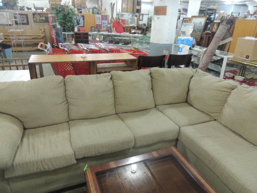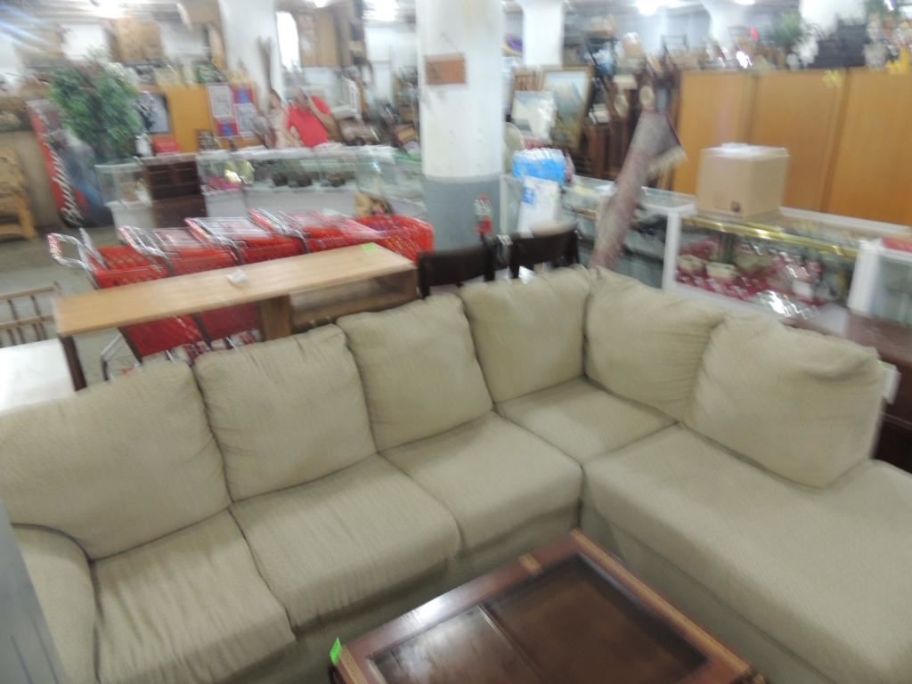 TAN LIGHT COLORED FABRIC SOFA, SECTIONAL SOFA, SOME SMALL TEARS AS SHOWN SEE PHOTO FOR MORE DETAILS.