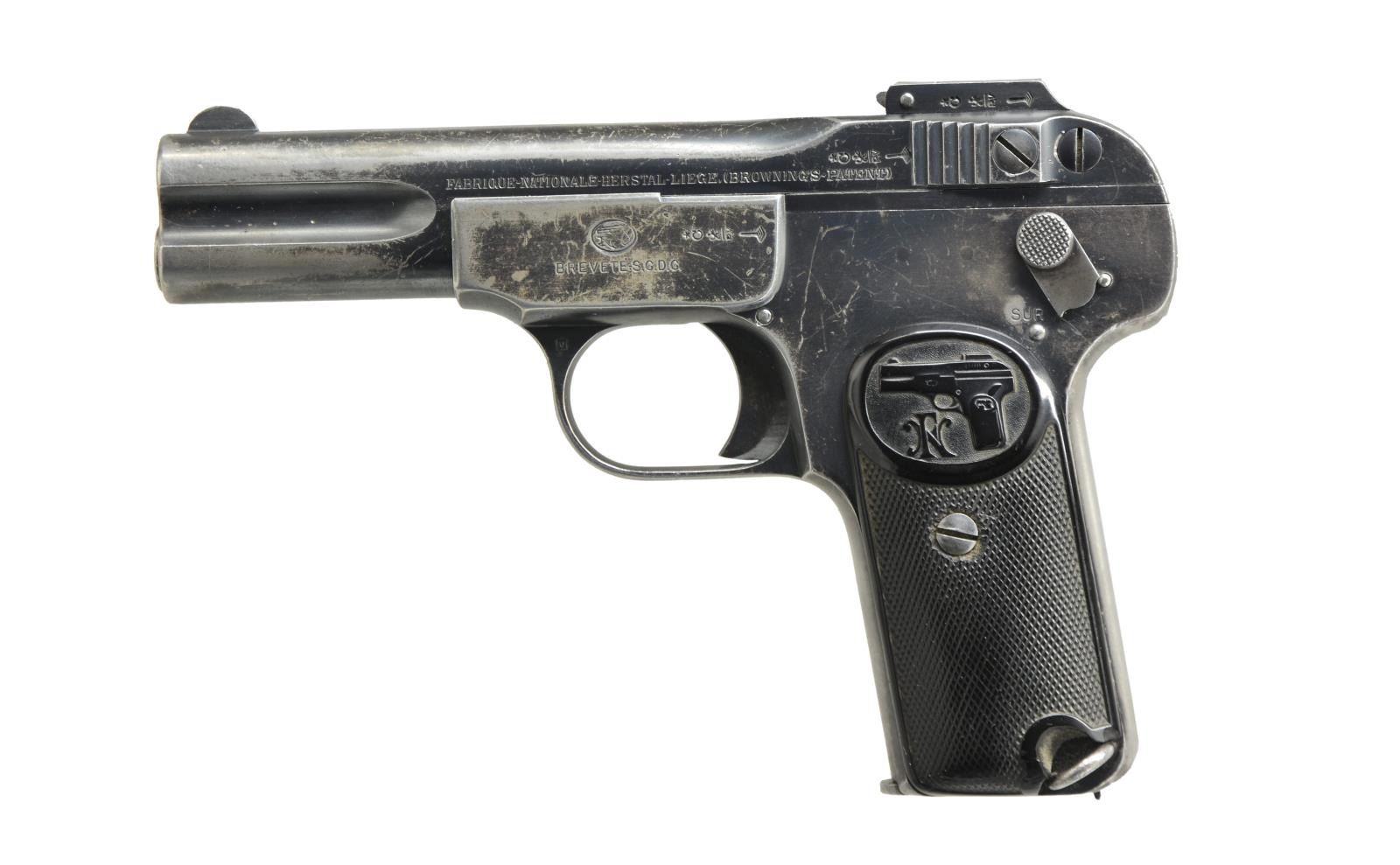 Cal. 7.65mm (32 ACP). S# 81529. Bbl. 4". Semi circular front sight w/ fixed V notch rear sight. Frame, slide & rear sight have matching numbers. Left side of frame has FN Herstal, Liege address w/ Browning patent marking. Frame is marked "BREVETE- S.G.D.G.". Left side lanyard loop & safety. 2 Piece checkered hard rubber grips. Mfg. 1900-1914. MAGS: 1 detachable 7 rd. CONDITION: 60% dull blue fading to spots of gray & showing scattered light scratches & marks. Grips have worn checkering w/ heaviest wear at bottom of right panel. Bore has lightly frosted appearance retaining sound rifling. (21-630/DS). CURIO. $700-1,000.