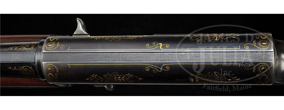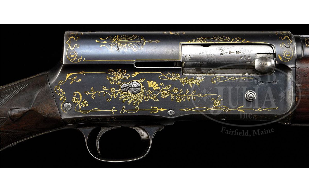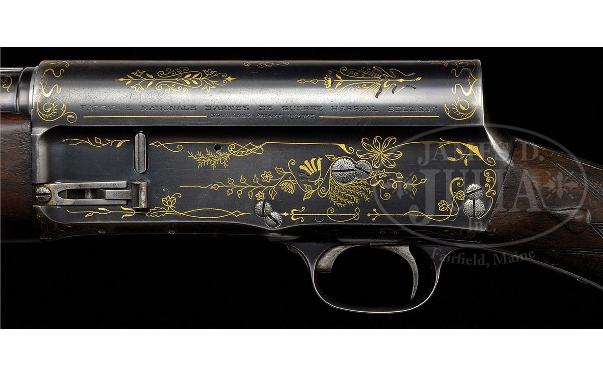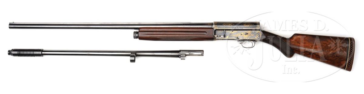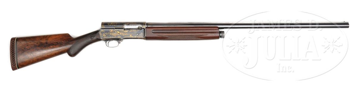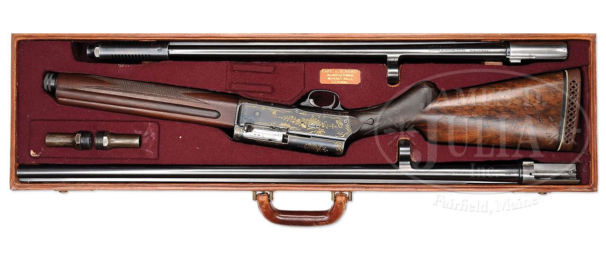 SN 60919. (1928) Cal. 16 ga. 2-3/4" Chamber. 29-3/8" and 24-3/4" Both bbls have raised, matted, solid rib. Short bbl is fitted with Cutt's Compensator. Long bbl is choked full. Both are marked "BROWNING ARMS COMPANY OGDEN UTAH", "BROWNINGS PATENT", and with "16 SPECIAL STEEL" on left side and "MADE IN BELGIUM" on right. There are 1" flourishes of gold inlaid scroll at breech ends. Blued action is marked "FABRIQUE NATIONALE D'ARMES DE GUERRE HERSTAL BELGIQUE" and with Browning patent information on top left. Action is strikingly and tastefully inlaid with open, scrolled gold wire with feather and floral highlights. Nicely marbled European walnut round knob stock measures 14-1/8" over old brown open-sided pad, over 3/4" wood spacer, which appears to be originally cut from this stock and reinstalled. There are nicely carved drop points behind small side panels. Forend appears to be a later replacement, and is of plain walnut. Drop at heel: 2-1/4", drop at comb: 1-9/16". Weight with long bbls: 7 lbs. 15 oz. LOP: 14-1/8". Gun comes in tan leather case with two spring latch closure, embossed on front edge "E. G. P." Interior is lined in dark burgundy felt, with gold embossed tag inside case which reads "Capt. A. H. Hardy" "Manufacturer" "Beverly Hills", "California". Case has space for action and both sets of bbls, and contains two Cutt's choke tubes marked modified and full, and wrench. CONDITION: Good, as refinished. Bbls and action retain most of an old re-blue. A number of small gold inlays are missing from action. Buttstock retains a considerable amount of what appears to be its orig finish worn through in many spots, with many marks and dents. Checkering is considerably worn. Forend retains most of what appears to be its orig finish. Bores are excellent. Case leather is still light in color, with numerous minor marks and scuffs, especially at corners. Handle is solid. Interior cloth is slightly mildewed with numerous marks and rubs from contact with bbls. 4-49061 MGM213
