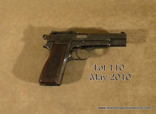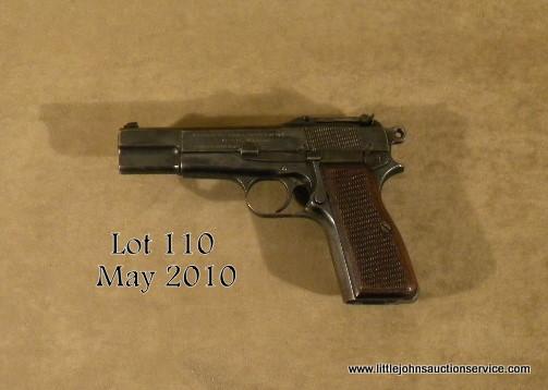 FABRIQUE NATIONALE Hi-Power, # 66852, 9mm, 4.675" barrel, blued finish, tangent sight with checkered walnut grips. Back strap is not cut for a shoulder stock. Rare Nazi marked Hi-Power in overall very good condition, 85-90% original bluethat is evenly thinning. Tangent sight is graduated from 50-500 meters, grips are very good showing losses to the checkering, but no chips or cracks. One Mec-Gar mag. Est. $500-$1,000.