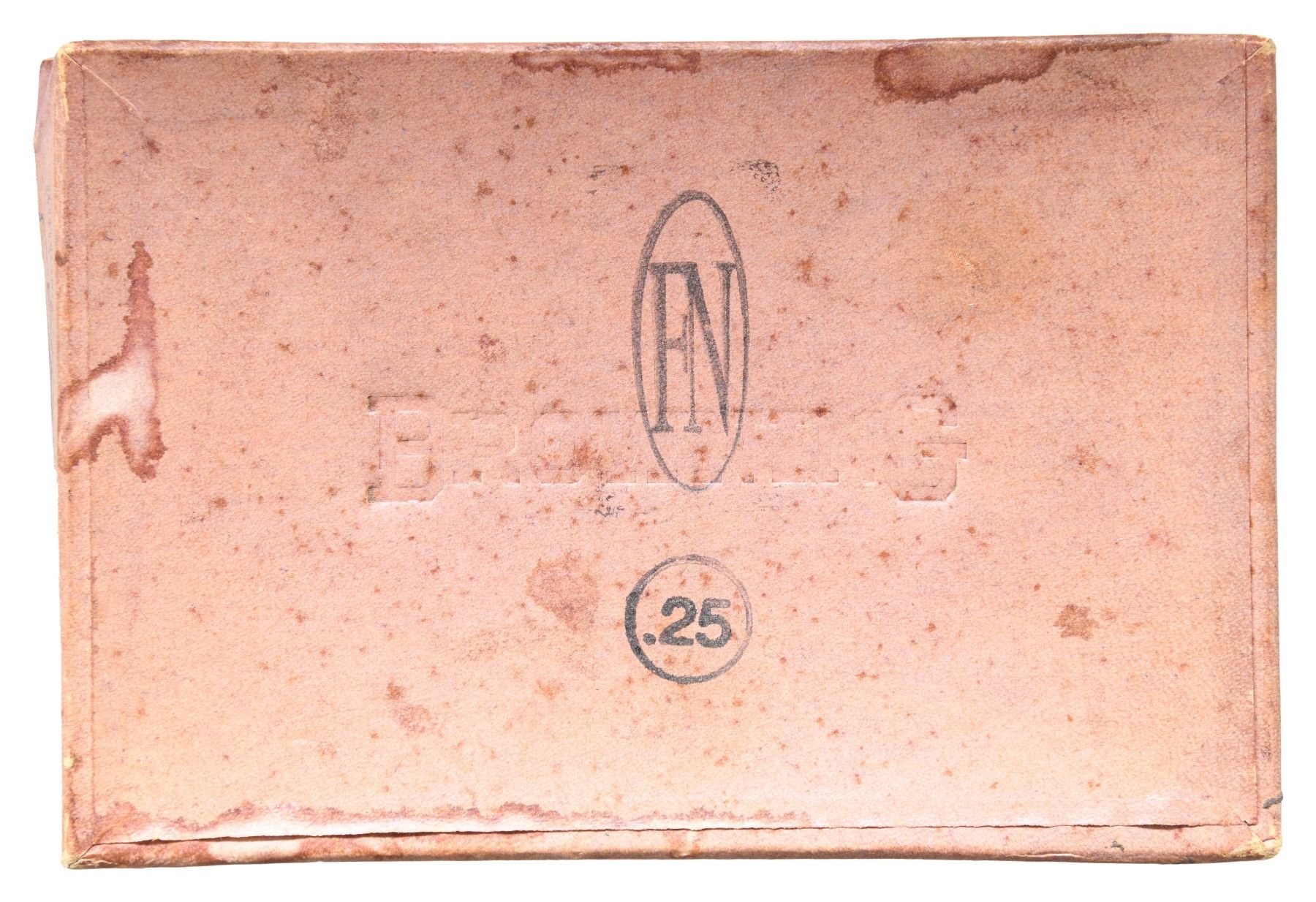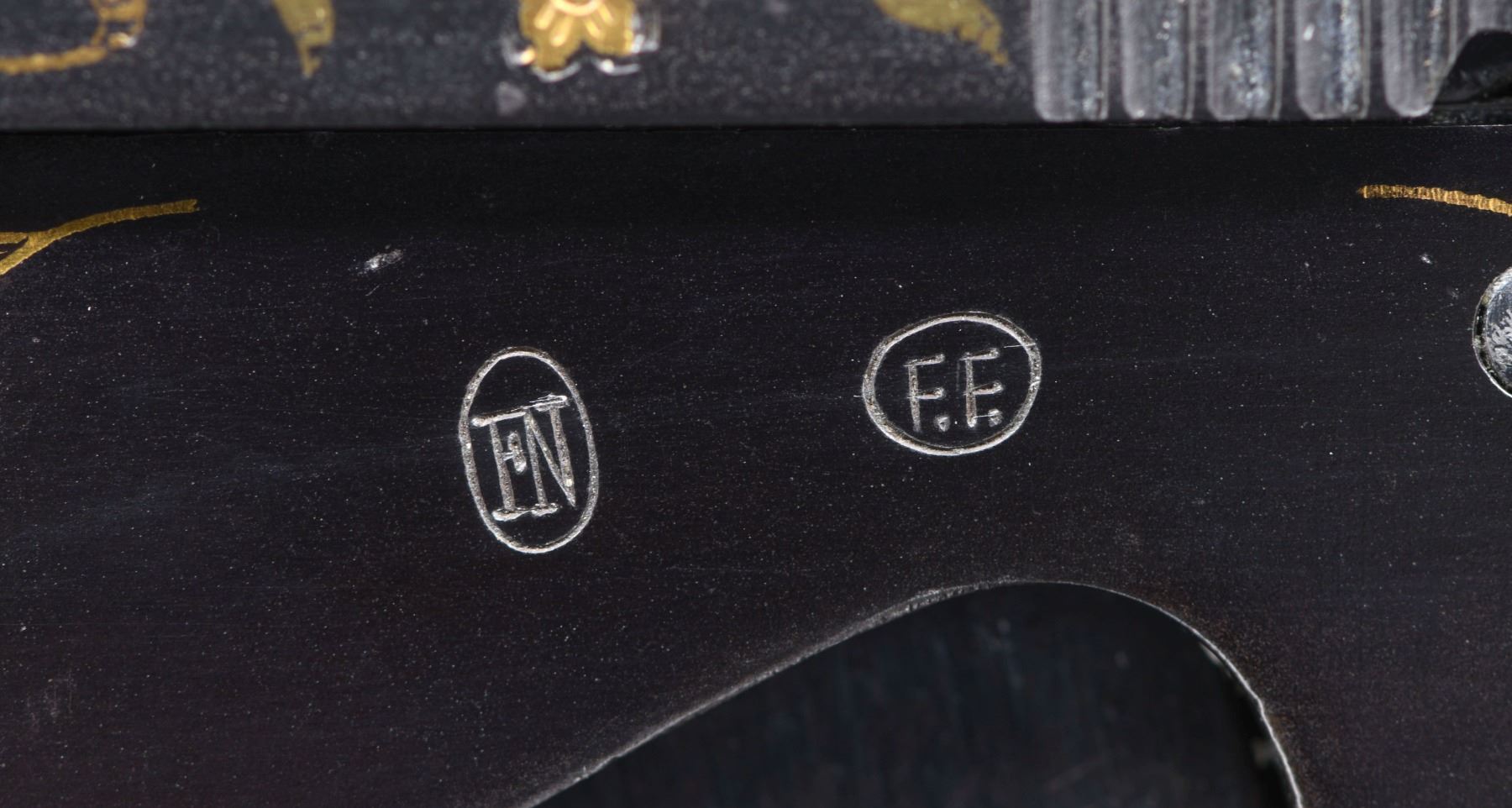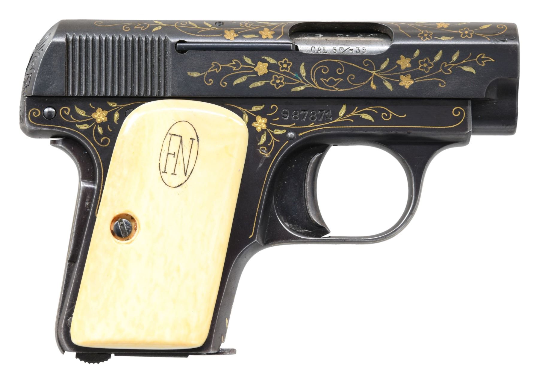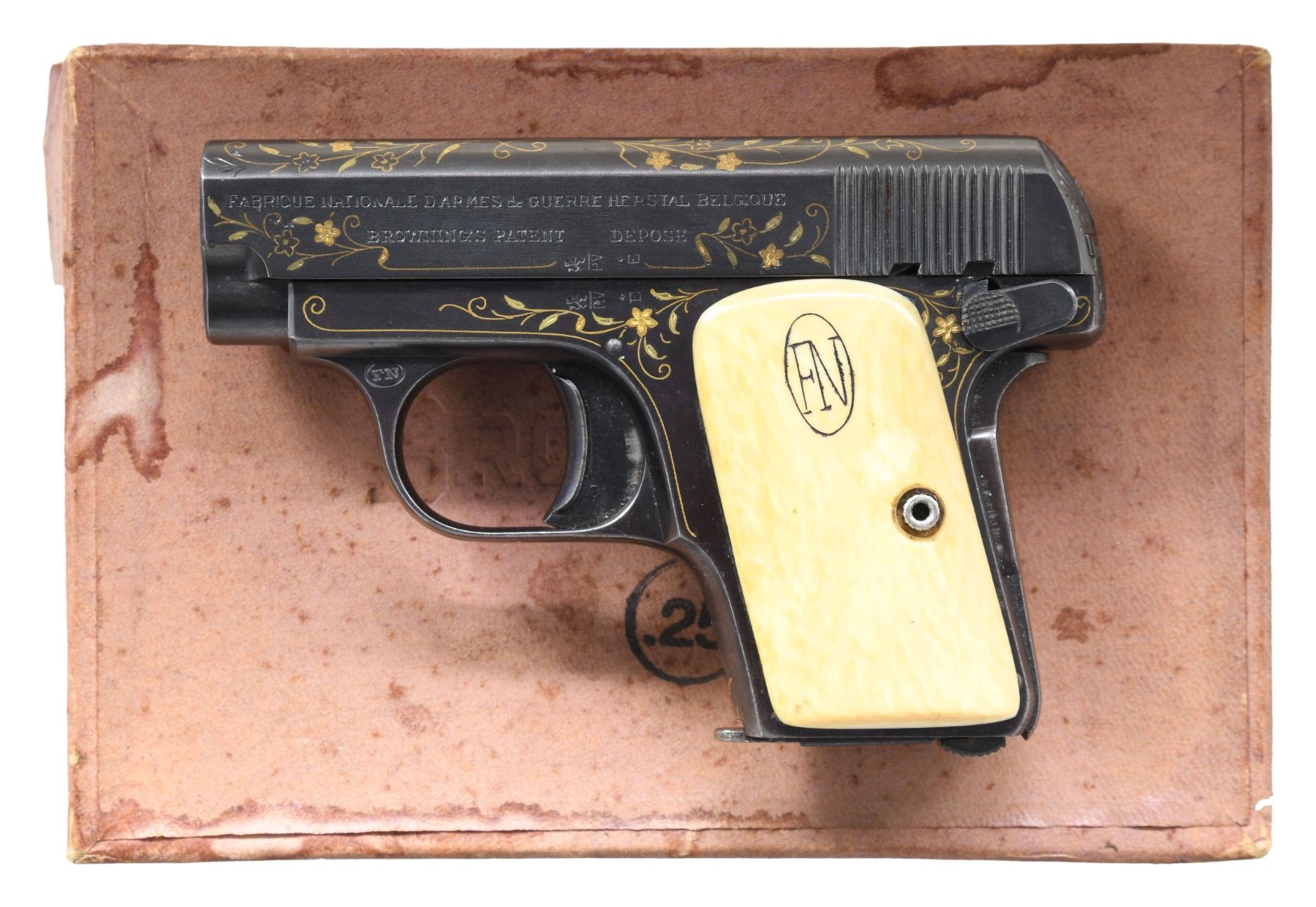 PISTOL, TYPE VI ENGRAVED, WITH FACTORY BOX. Cal. 25. S# 987871. Bbl. 2 1/8". Model 1905 semi-automatic pistol mfg. by Fabrique Nationale. The left side of the slide is marked "FABRIQUE NATIONALE D ARMES de GUERRE HERSTAL BELGIQUE/ BROWNING'S PATENT DEPOSE". Left side of the frame, slide, and right side of the bbl. exhibit Belgian commercial proofs. Left side of the frame is engraved with a small "FN" within an oval, followed by an encircled "F.F." ("F.F." also engraved on right side) beneath the grip panel. Frame, slide, and grip safety exhibit foliate gold inlays in the factory Type VI pattern. Frame appears to retain its original blue finish, with the slide having been reblued at one time. Frame is mounted with 2-piece ivory grips, which are embellished, with "FN" within an oval at the top of the panels. Grips no longer retain their escutcheons at the screw slots, with the left panel exhibiting a contemporary screw nut. Slide features a grooved sight channel, with a fixed blade front sight and U-notch rear sight. All serialized parts are matching and include the frame, slide, and bbl. MAGS: 1 6-rd. UNATTACHED ACCESSORIES: original factory box, ink stamped "FN" within an oval above an encircled ".25", and an impressed "BROWNING" on the lid. CONDITION: frame retains the majority of its original factory blue finish, exhibiting some areas of wear and thinning that show through to gray patina, as well as some scattered spots of light to mild surface oxidation. Slide is very good, as refinished, exhibiting light surface level pitting overall, with a few scattered spots of mild pitting. Mirror bore, exhibiting well defined rifling throughout. Grips are very good, retaining a pleasing mellow patina, while showing some light superficial marks from handling and storage. Box exhibits some light to mild wear, scattered spots of staining, and age related discoloration overall. 2 corners of the lid show some tearing, but box otherwise remains sturdy and serviceable. (25-1198/MLW). CURIO. $1,000-1,500.