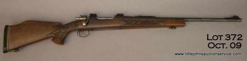 FABRIQUE NATIONALE Musketeer bolt action rifle, barrel marked J.C. Higgins Model 50, .270 Win. Cal., 22” barrel, carved walnut Monte Carlo style stock with rubber recoil pad. Rifle is in good condition with approximately 50%-60% originalfinish which is thinning. Iron sights with receiver drilled and tapped with scope mounts. Bore is good and should improve with cleaning. Est. $125-$250.