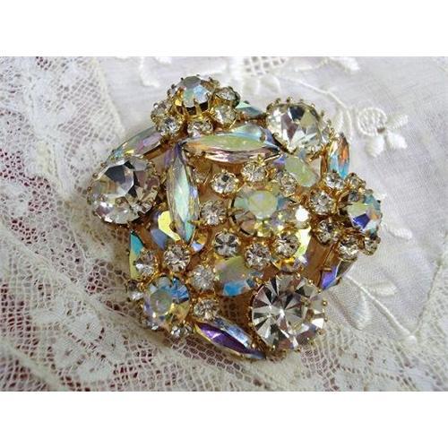 MARVELOUS "EXTREME BEAUTY" VINTAGE AURORA BOREALIS RHINESTONE BROOCH, MADE FROM WIDE VARIOETY OF SIZES FACETED STONES, EACH HAND SET AND PRONG HELD, THE STONES ARE SET AT DIFFERENT HEIGHT, WHICH MAKES THIS BROOCH EXTRAORDINARY, as per images - Excellent condition, Measuring close to 3 1/2 inch in diam., Stone measures about 1 3/4 long, US Buyer please remit 7.00 for shipping plus insurance.THANKS.