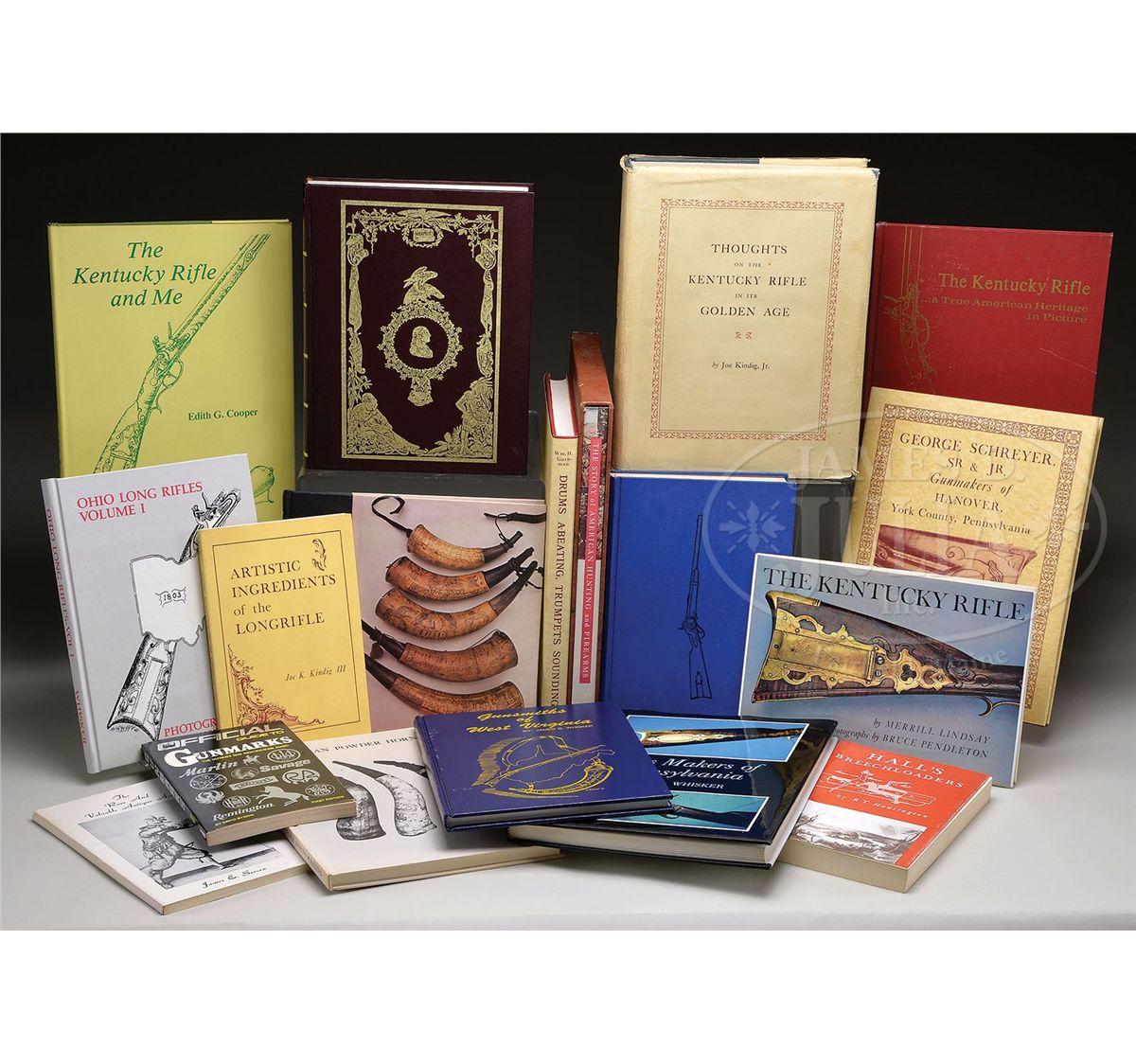 This archive contains about 50 books, mostly first editions, concerning mostly the collecting of Kentucky Rifles, Pennsylvania Rifles, Early American Flintlocks, etc. Books concerning the Golden Age of American Longrifles include: Heckert & Vaughn The Pennsylvania-Kentucky Rifle, Chandler & Whisker Pennsylvania Gunmakers, Samuel Dyke The Pennsylvania Rifle, Shumway Pennsylvania Longrifles of Note, S.E. Dyke Thoughts on the American Flintlock Pistol, Nathan Swayze The Rappahannock Forge, Whisker & Chandler Arms Makers of Eastern Pennsylvania, Whisker & Whisker The Gunmakers and Gunsmiths of Western Pennsylvania, Madison Grant The Kentucky Rifle Hunting Pouch, Metzgar & Whisker Gunsmiths of Western Pennsylvania Vol. 1, Whisker & Whisker Bedford County Gunsmiths and Gunmakers, James B. Whisker Gunsmiths of West Virginia and Ohio Long Rifles Vol. 1, Roy Chandler Kentucky Rifle Patchboxes & Barrel Marks, William H. Guthman Drums A'beating Trumpets Sounding, Shumway George Schreyer Sr. & Jr., Shumway Rifles of Colonial America Vols. 1 and 2, John Rice Irwin Guns and Gunmaking tools of Southern Appalachia, Stephen V. Grancsay American Powder Horns, Kentucky Rifle Association's The Kentucky Rifle....A True American Heritage in Pictures, James R. Johnston Kentucky Rifles & Pistols 1750-1850, Garavaglia & Worman Firearms of the American West, Buchele, Shumway & Alexander Recreating the American Longrifle, Merrill Lindsay The Kentucky Rifle, Kindig Artistic Ingredients of the Longrifle, Charles Edward Chapel Guns of the Old West, James B. Whisker Arms Makers of Pennsylvania, Kentucky Rifle Associations newsletter Vol. 1-6 bound in two books, Edith G. Cooper The Kentucky Rifle & Me, Henry J. Kauffman The Pennsylvania-Kentucky Rifle, Kindig Thoughts on the Kentucky Rifle in its Golden Age, James R. Johnston Accouterments, James B. Whisker Gunsmiths of Adams, Franklin and Cumberland Counties, Pennsylvania, Locke Collection, and John S.duMont American Engraved Powder Horns. PROVENANCE: Collection of Frank Sujansky. CONDITION: Books overall are in very good "fine condition" many have orig dust jackets and several volumes noted were signed. There are duplicates of several of the books also. 4-49720 JS238