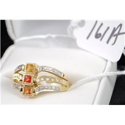 WOMENS CUSTOM MADE 14K YELLOW GOLD RING SET WITH 24 HAND SET DIAMONDS AND THREE COLORED GEMSTONES (BELIEVED TO BE GOLDEN TOPAZ, CITRINE & GAR...