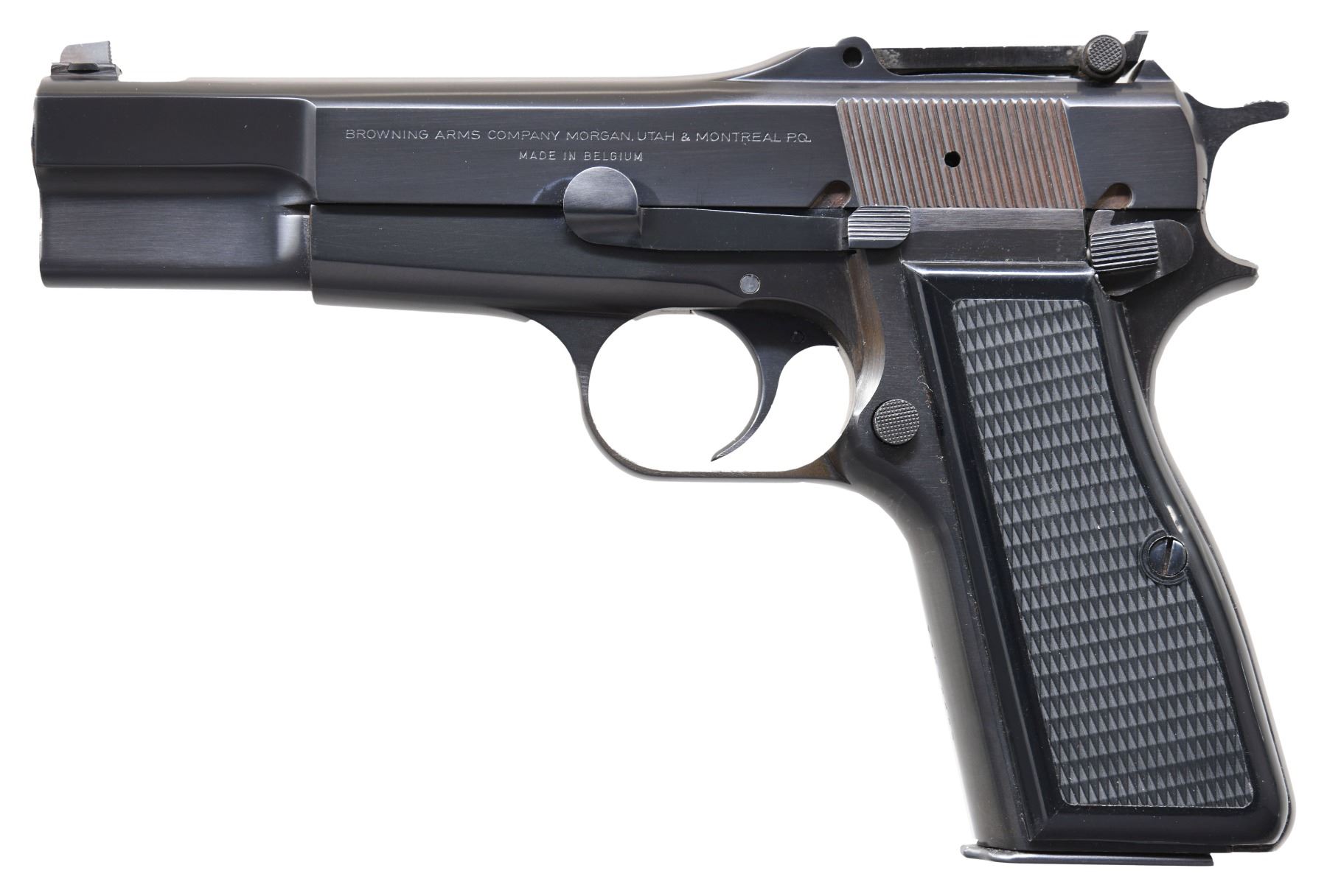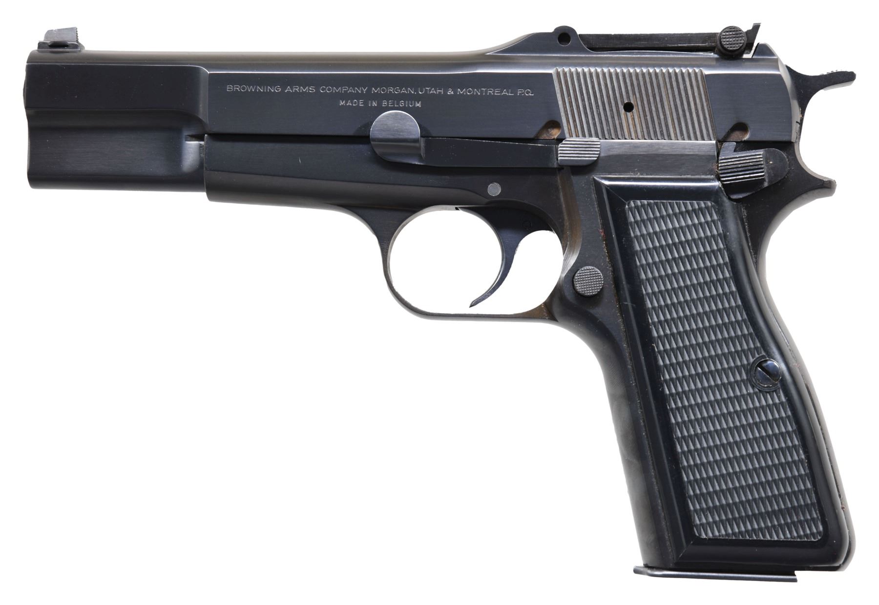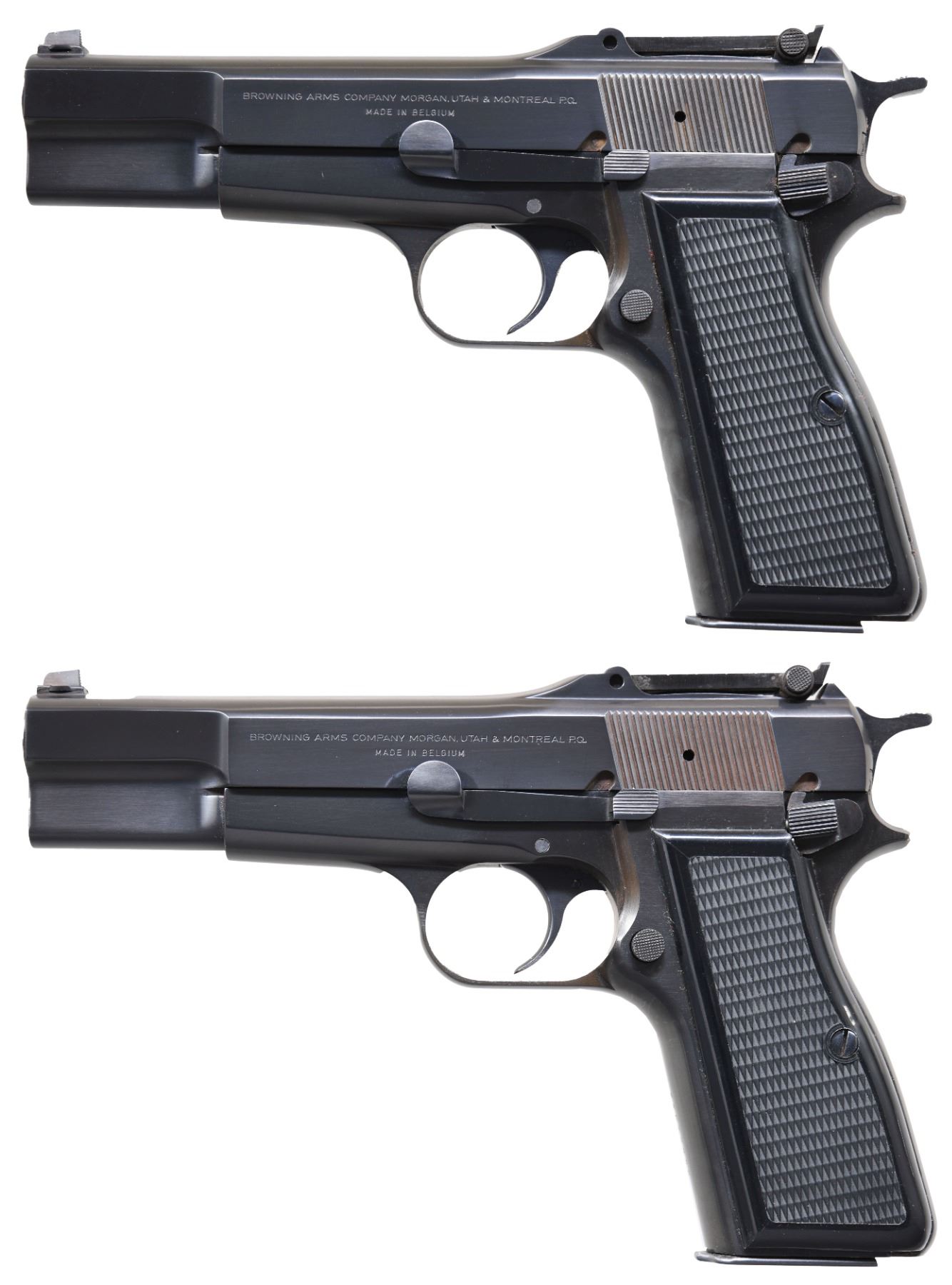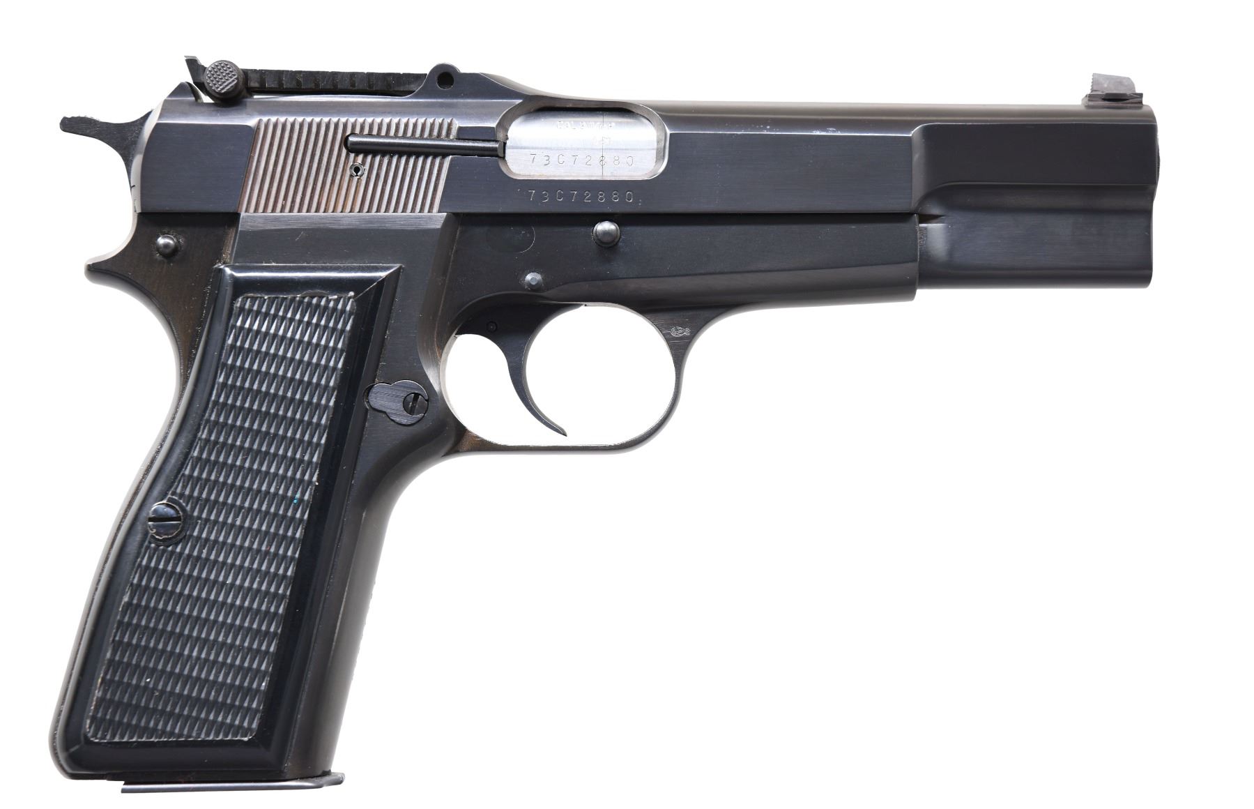 HIGH POWER "EL CAPITAN" SEMI-AUTOMATIC PISTOLS WITH MATCHING FACTORY SOFT CASES. 1) BELGIAN BROWNING "EL CAPITAN" HIGH POWER SEMI-AUTOMATIC PISTOL. Cal.9mm Luger. S# 73C72880. Bbl. 4 5/8". High Power "El Capitan" semi-automatic pistol mfg. in Belgium by Fabrique Nationale and imported by Browning Arms Company in 1973. The left side of the slide is marked with Browning's importer information above "MADE IN BELGIUM". Right side of the frame and 2-piece bbl. exhibit a single Belgian commercial proof. Metal components exhibit a polished blue finish, save for on the bbl., which is polished in-the-white. Frame is mounted with 2-piece checkered black synthetic grips. Dovetailed blade front sight, with V-notch adj. rear sight, graduated 50-500. New style "spur" hammer, with slotted backstrap on frame. All serialized parts are matching and include the frame (front grip strap), as well as the slide and bbl. (on right). MAGS: 1 13-rd. mag., with phosphate finished body and blued button type follower. UNATTACHED ACCESSORIES: black leather Browning soft case, with "M/S" above the full S# "73C72879" handwritten on the exterior tag. CONDITION: fine, with metal components retaining bountiful amounts of their original blue finish overall, save for a few light superficial handling marks overall. Brilliant mirror bore, exhibiting a thick layer of grease overall, while retaining well defined rifling throughout. Grips are excellent overall. Soft case is excellent. (25-260/MLW). 2) BELGIAN BROWNING HIGH POWER "EL CAPITAN" SEMI-AUTOMATIC PISTOL. Cal. 9mm Luger. S# 73C72880. Bbl. 4 5/8". High Power "El Capitan" semi-automatic pistol mfg. in Belgium by Fabrique Nationale and imported by Browning Arms Company in 1973. The left side of the slide is marked with Browning's importer information above "MADE IN BELGIUM". Right side of the frame and 2-piece bbl. exhibit a single Belgian commercial proof. Metal components exhibit a polished blue finish overall, save for on the bbl., which is polished in-the-white. Frame is mounted with 2-piece checkered black synthetic grips. Dovetailed blade front sight, with V-notch tangent rear sight, graduated 50-500. New style "spur" hammer, with slotted backstrap on frame. All serialized parts are matching and include the frame (front grip strap), as well as the slide and bbl. (on right). MAGS: 1 13-rd. mag., with phosphate finished body and blued button style floorplate. UNATTACHED ACCESSORIES: black leather Browning soft case, with "M/S" above the full S# "73C72880" handwritten on the exterior tag. CONDITION: fine, with metal components retaining bountiful amounts of their original factory blue finish overall. Brilliant mirror bore, exhibiting sharp and well defined rifling throughout. Grips are excellent overall. Soft case is excellent. A fabulous consecutively numbered pair of Belgian Browning "El Capitan" High Power semi-automatic pistols. PROVENANCE: the Estate Collection of Charles Wagner. (25-261/MLW). BOTH CURIO. $3,000-5,000.