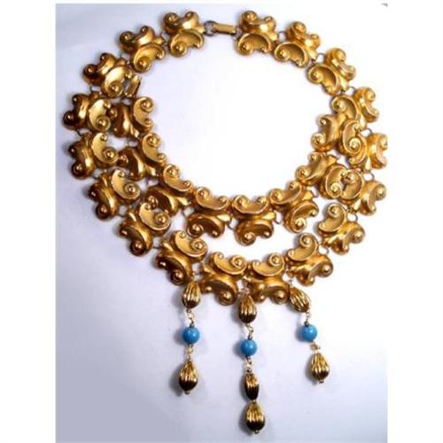 WHAT a FABULOUS 1930?s set with its ornate fancy gilt links and the golden drops with turquoise accents. This has the choker and the bracelet too!. The necklace is 15" long and the bracelet is 7" long. Both are 1" wide and made of quality links. This is in very good condition and really brings back the flair of the Egyptian revival!