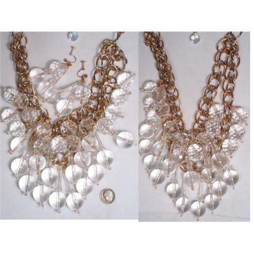 OH LA LA this is such an amazing piece I had to take a lot of photos to give you an idea of the SHEER SIZE of this set!!!( check out the photo next to a DIME and remember to click on the photos to enlarge them).I have more photos of this set if you want to email me.WOW it is BIG! It is bold~! It has HOLLYWOOD all over it!! IT looks like pools of light with all the luminescence that comes thru!!! This treasure weighs 334 grams and has TWO layered BIBS!! Notice that one layer has the huge faceted beads and the bottom ones are long stems with bottoms ( these are two pieces each that look like icicles with balls at the bottom). These all hang from a thick golden chain that measures up to 23" long on the inside of the neck..( it has an extender)What really makes this quite a nifty piece is that you can actually wear a row of drops on the front, a row on your back and use the extender in the front . Imagine THAT with a backless dress!!!! WOW!I have never seen such a large magnificent set such as this! The 6" long bib alone is over long in the front. All the beads are in great condition and really give off bright light from all the facets. Pools of light are rock crystal and these faux pools are identical except not rock crystal. You won't be able to tell the difference.This is a set that would have come off a runway of a high fashion show and would have really made whatever dress it was worn with look like a million bucks!!This is the first time it has ever been offered for sale ...