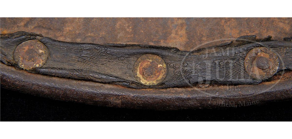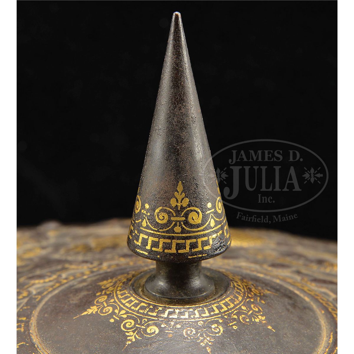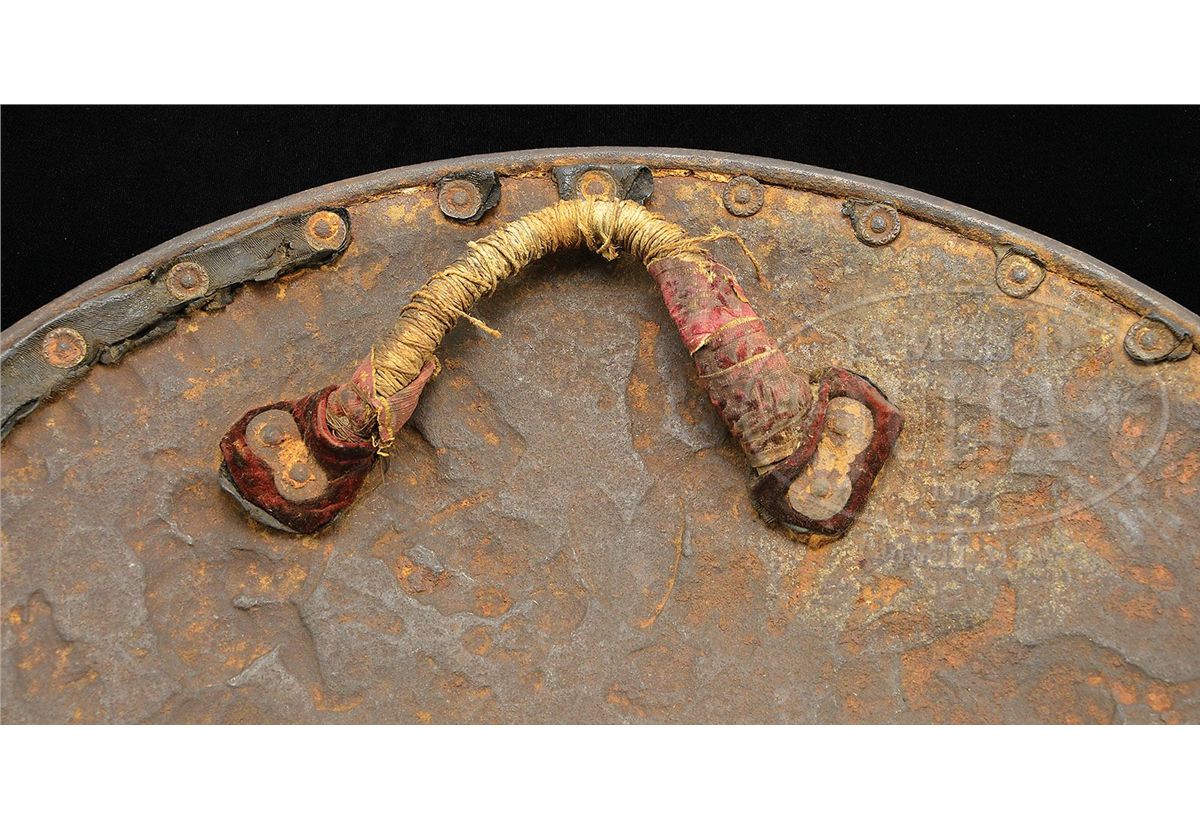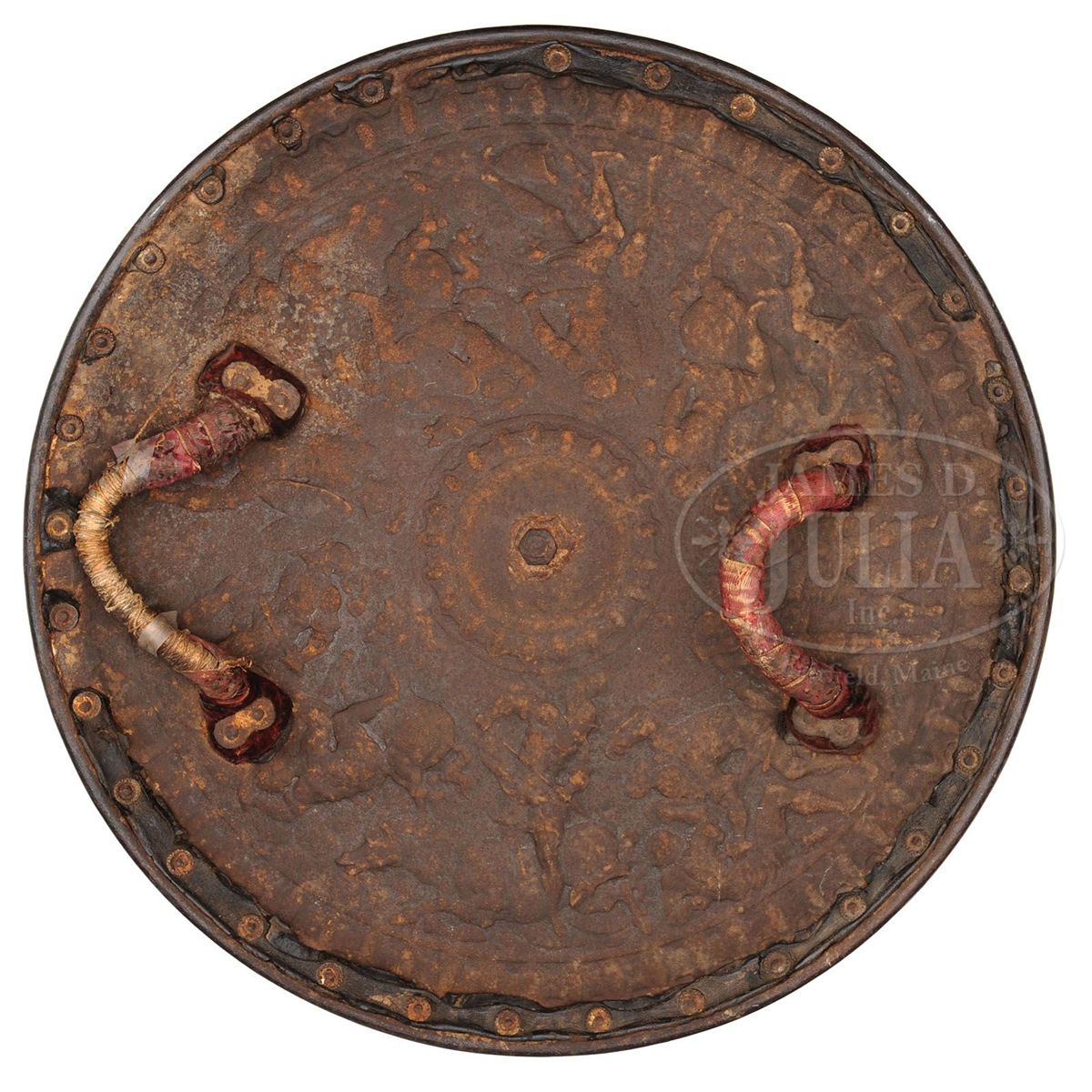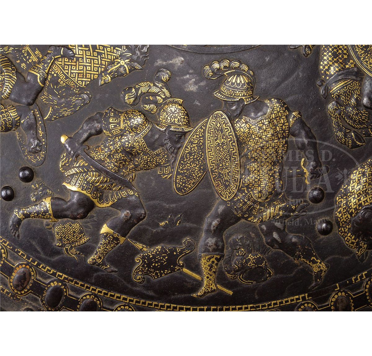 This wonderful work of art, relief embossed parade shield is an opportunity to acquire a shield which, if it were from the Negroli Workshop, would cost six figures. Entire shield is repoussed/embossed with a battle scene featuring warriors on horseback and in foot combat carrying shields, spears and wearing Romanesque helmets. Shield has central spike damascened in gold. All details of warriors, armor and horses detailed in gold damascene as well. Roped rim is folded properly. Inside of shield shows great age with the deteriorated leather, velvet grips and flax cords. Construction throughout is in the style of 16th century examples which may be found in the Metropolitan Museum, the Wallace Collection in London and great museums throughout the world. This is a beautiful work of art and as there are no similar period shields available, this lovely piece will have to serve the collector of high art armor. PROVENANCE: Joe Kindig, Jr., York, Pennsylvania. CONDITION: Excellent for type. Metal is deep even age brown. Some loss to gold decoration. 4-49161 MRZ72
