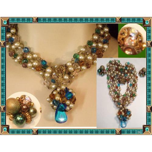 This highly ornate HAskell Glass necklace has 8 strands of hand wired and beaded chain with this masterpiece center that is loaded with glass turquoise color and amber colored beads with pearl color bead accents. Set in this rich filigree framework it has a huge cut glass tear drop that finishes off this in the most beautiful and dramatic way. The slide in clasp is rich in patina and the length around the neck is 17". The massive drop is an additional 2 1/2". The earrings are clip on they have brass and rhinestone beads that are like rondell balls. Very old and very pretty. The clasp is original and in my opinion needs a safety chain to hold some of the weight of this gorgeous piece. I will be glad to add it if you like. This is all hand wired and hand beaded and ever prettier than the photos!Unsigned.