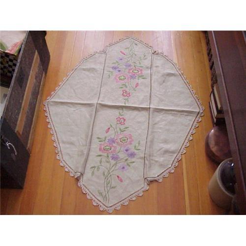 I can never stop marvelling at this type of handwork! This is a beautiful large tablecloth for a hallway or parlour table from about 1890-1910s Arts and Crafts era that has wonderful silken embroidery work on rich oatmeal colour heavy linen. It is graced with such lovely hand embroidered flowers and finished with crocheted lace trim. It measures about 44 inches by 36 inches, in very nice condition, one tiny spec from storage otherwise just fine. A beautiful example of Arts and Crafts embroidery work to decorate with and enjoy adding to your collection of fine antique linens. If you enjoy collecting antique and vintage lace and linens, barkcloth, all things roses, Limoges & English china,Shabby Chic, Romantic Cottage and Paris Apartment décor , you may wish to bookmark us since we list often. Thanks and enjoy your day!