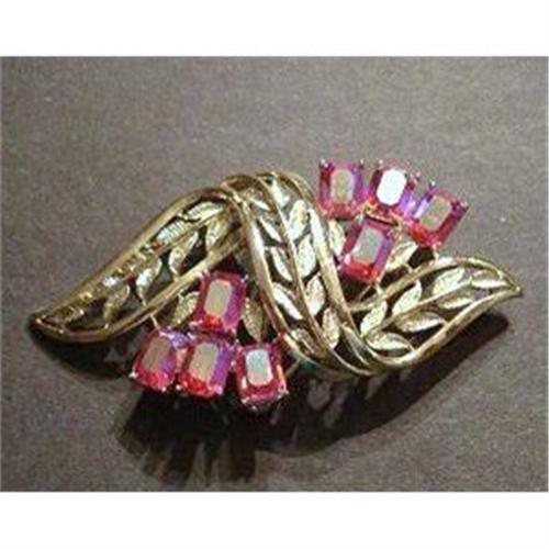 BEAUTIFUL RHINESTONE BROOCH, MADE BY CORO,DEPICTING GORGEOUS IRIDESCENT RED STONES AND AND GOLD TONE FINISH,excellent condition,measures about 3" long, US Buyer to pay 7.00 for shipping plus insurance.THANKS.