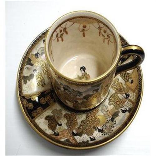 THIS IS LOVELY ANTIQUE DEMITASE CUP AND SAUCER,MADE IN SATSUMA STYLE, IT IS A LITTLE GEM BEING HAND PAINTED SHOWING IN GREAT DETAIL IN GOLD, BLACK AND BEIGE COLORS LOVELY GEISHA GIRLS, WHITE DAIDIES OVER THE LOVELY HEAVY GILT WHICH - Excellent condition with glaze crazing on inside the cup - Cup measures about 2 1/4" high and saucer 4 3/4" in diam., US Buyer to pay 7.00 for shipping plus insurance.THANKS.