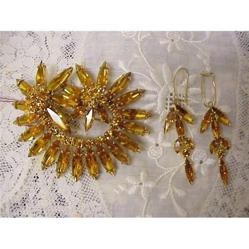 THIS IS VERY BEAUTIFUL 3 PIECE SET, LOVE THE WARM GOLDEN AMBER COLOR - LARGE FLORAL BROOCH AND PIERCED EARRINGS, BROOCH IS SIGNED "SHERMAN" BUT EARRINGS ARE NOT BUT DEFINATELLY MATCHING, THE COLOR, FACETING AND STONES ARE SUPERB, BROOCH MEASURES 2 1/4" LONG,AND 1 1/4" WIDE, EACH EARRING MEASURES ABOUT 2" LONG, EXCELLENT, MINT CONDITION - US BUYER TO PAY 7.00 FOR SHIPPING PLUS INSURANCE.THANK YOU!