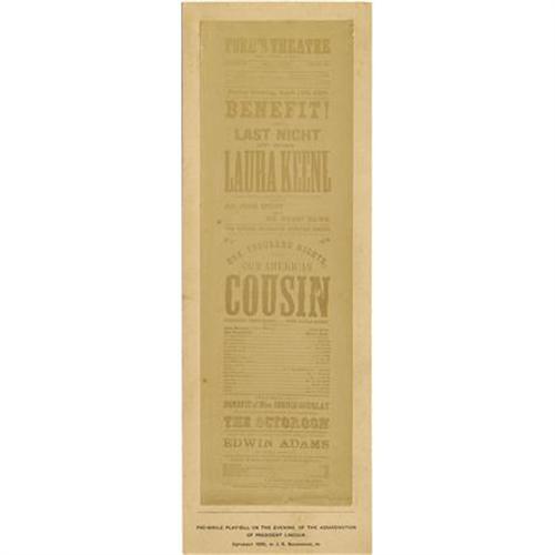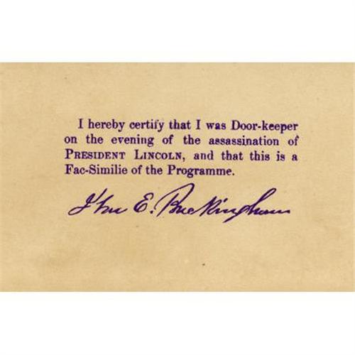 <B>"FAC-SIMILE PLAY-BILL ON THE EVENING OF THE ASSASSINATION OF PRESIDENT LINCOLN", 1890.</B></I> A photograph of the playbill from the evening of President Lincoln's assassination. Printed on verso: "I hereby certify that I was Door-keeper on the evening of the assassination of President Lincoln, and that this is a Fac-Similie of the Programme signed J. E. Buckingham." 3.5” x 10.5”. <BR><BR><B>Provenance: </B></I><I>Al. Emmett Fostell Collection</B></I><B><I></B></I></B></I><BR><BR><B>Condition:</B></I> Fine condition, light contrast.<BR><BR><b>Shipping:</b> Miscellaneous Collectibles, Smal (<a target="_blank" href="http://www.heritageauctions.com/common/shipping.php">view shipping information</a>)