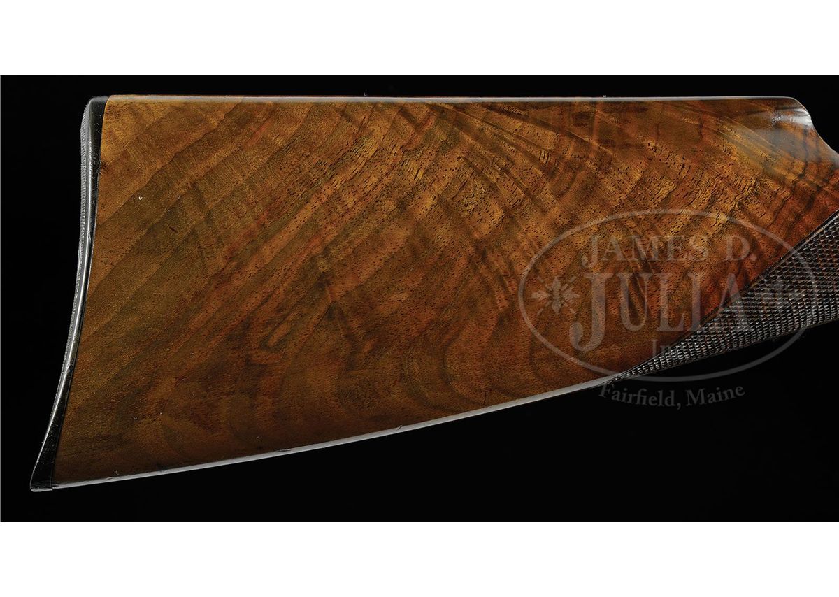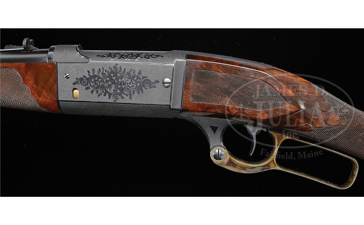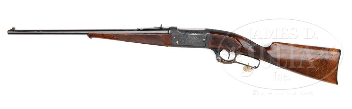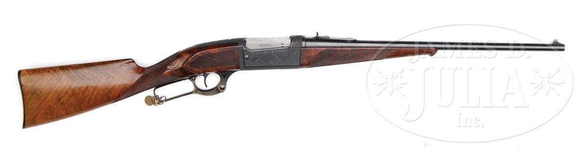 SN 110029. Cal. 303 Savage. 20" bbl. Entire receiver, top strap and backstrap has full excelsior treatment with A style engraving on both sides. Engraved in relief on bottom of receiver is "F.W. Plaisted". The orig B grade wood is a very beautiful fancy grained American walnut with hard rubber composition style buttplate. The Excelsior treatment is probably one of the most attractive engraving patterns Savage used where the full receiver is matted, leaving the engraving area in relief a polished luster blue. Factory letter authenticating information. PROVENANCE: George Adams, LeRoy Merz, Wes Adams Estate Collection. CONDITION: Overall gun in excellent plus condition retaining nearly all orig bright blue, orig wood is excellent plus with high gloss lacquer finish. Beautiful gun inside and out, hard to improve upon. Bright shiny bore. 4-44830 LM57