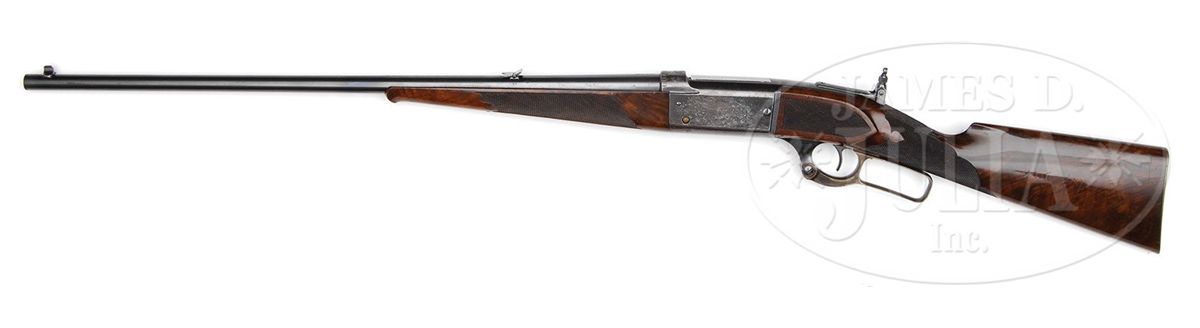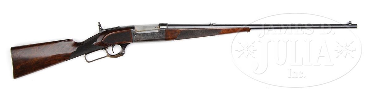 SN 24411. CAL. 303. 26" full round bbl with original Lyman front sight, two-leaf flip up rear sight and folding tang sight. Very attractive little gun featured the Leader grade style of engraving with vignettes of deer on each side. Original B-grade checkered deluxe wood is finished with a steel shotgun style buttplate. PROVENANCE: George Adams Collection; LeRoy Merz Collection; Wes Adams Estate Collection. CONDITION: Excellent. Bbl retains 90% plus bright blue, receiver retains approximately 80% original bright blue. Lever retains vibrant case colors. Fancy burl deluxe stocks are in excellent condition with most of the original lacquer. Bright shiny bore. Very attractive original Savage rifle. 4-44783 LM87