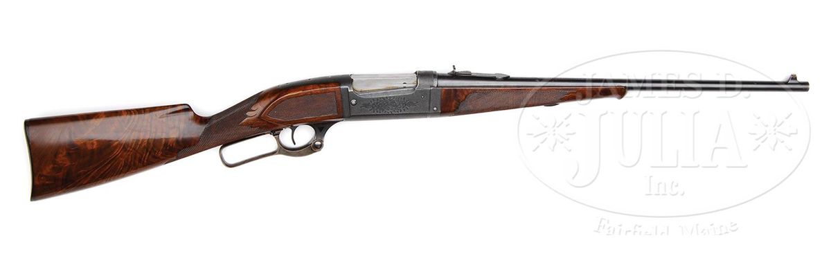 SN 126490. cal. 22 high power. 20" bbl. Gun features the full excelsior matted receiver with A grade engraving and B grade checkered fancy deluxe burl stock with orig hard rubber shotgun style buttplate. Orig sights. PROVENANCE: George Adams, LeRoy Merz, Wes Adams Estate Collection. CONDITION: Excellent. Bbl retains 98% bright blue, receiver 96-97% bright blue. Excellent wood with most orig lacquer finish and sharp checkering. Bright shiny bore.Vivid case colors remaining on lever. All orig inside and out. 4-44829 LM58