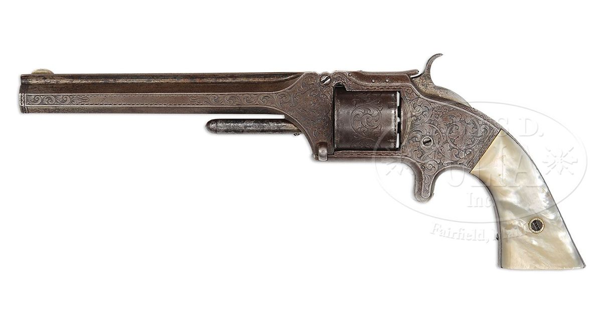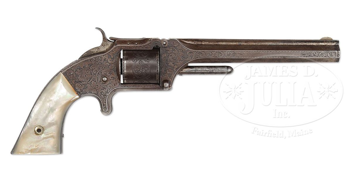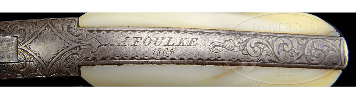 SN 17160. Cal. 32. This is a nice example of the popular Civil War sidearm with 6" bbl with rarely found factory engraving (Louis D. Nimschke) and pearl grips. Inscription engraved on backstrap reads "A. FOULKE 1864". Andrew Foulke was a military sutler made famous by Dr. Francis Lord by using a war time photograph of Foulke's army tent with a sign reading "A FOULKE SUTLER, 1ST BRIGADE, HORSE ARTY" as the dust jacket cover of his book Civil War Sutlers. Sutlers in the Army were civilians who were allowed to sell various goods to soldiers and many had very unsavory and unscrupulous reputations among the soldiers he was selling to. This arm was part of a NRA National Firearms Museum display of "exceptional arms" in 2003. This was one of those arms and it is pictured in the publication titled Exceptional Arms. Based on a wonderful article by Marlan Polhemus (American Society of Arms Collectors, Bulletin #85, April 2002) we feel Foulke was not among the hated and appears to have been an honest merchant, though quite prosperous. "While this inscribed revolver was the possession of only a military/civilian merchant, and not of some gallant officer with many heroic deeds, it remains a very unique piece, if not one-of-a-kind, inscribed to a Civil War sutler." A copy of these articles along with a large portfolio of research and information accompanies this firearm, including a copy of Foulke Family genealogy. Also included are a series of 8X10 photos of A. Foulke's Sutler Tent by John Gibson (Matthew Brady's Studio); an image copy of Andrew Foulke provided by his family; and a Life Magazine, dated Feb. 3, 1961, showing Foulke Sutler Tent. PROVENANCE: Marlan Polhemus Collection. CONDITION: Gun retains strong traces of its original silver finish on frame, cyl and bbl with staining and pitting and balance of metal gray/brown. Maker's address on bbl flat is crisp and easily read as are serial numbers. Pearl grips are sound and solid and well fit. Mechanically gun functions well with well discerned rifling. 4-48741 JS62