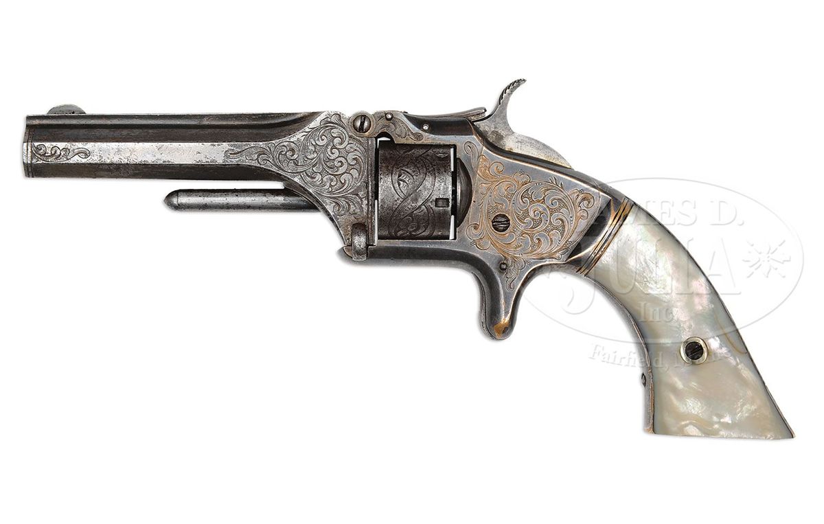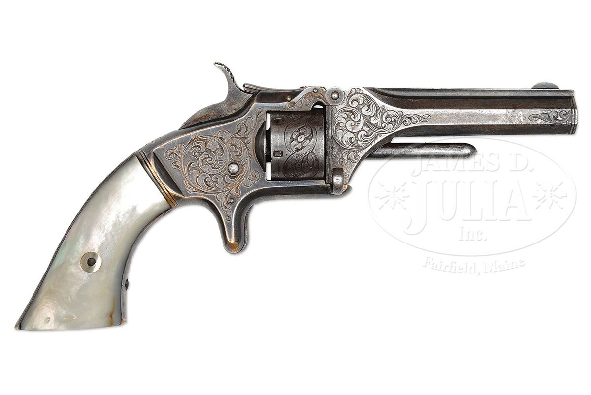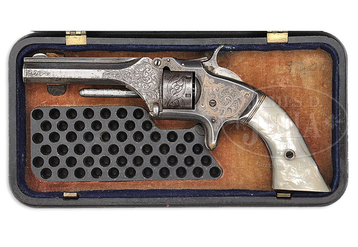 FACTORY ENGRAVED SMITH & WESSON GUTTA-PERCHA CASED MODEL #1, SECOND ISSUE REVOLVER WITH PEARL GRIPS.