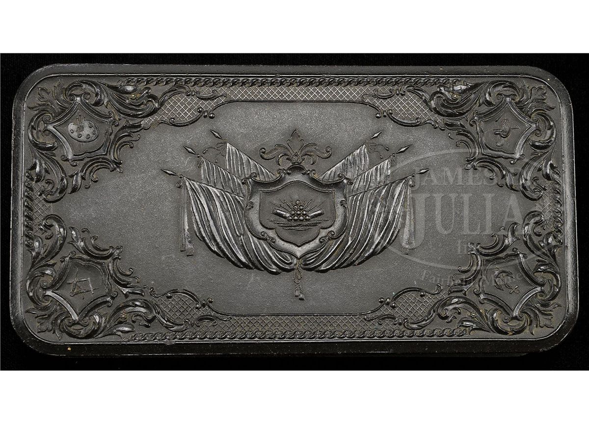 SN 86903. Cal. 22. This little gem was something to behold when it was new. This is among the highest grade you will find in these guns. Engraved, gold highlights and mother-of-pearl grips in a scarce Smith & Wesson gutta-percha "Flags" case, embossed with large Panoply of Arms. PROVENANCE: Marlan Polhemus Collection. CONDITION: Bbl is silver/brown overall with strong remnants of silver finish in protected areas with staining and pitting. Engraved cylinder is silver/brown overall with pitting, silver plated engraved frame, retains about 90% of its orig silver with traces of gold highlights in recesses of engraving. Pearl grips are sound and well fit with good color, with one small chip at rear toe on right. Gun mechanically functions with crisp rifling to bore. The gun has matching assembly numbers.ÊÊCase is very good to fine overall with a few hairline cracks on sides that do not affect aesthetics of this lovely pistol case. Case still functions and clasps. Interior has some soiling, especially to faded velvet in bottom. The ears to the bbl support internally are missing, otherwise case is fine. 4-48728 JS85