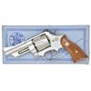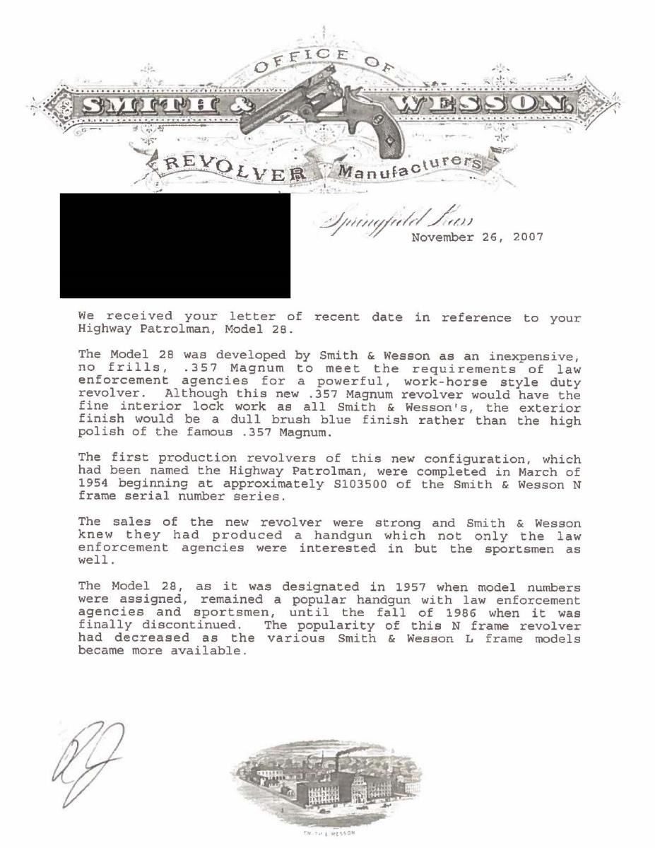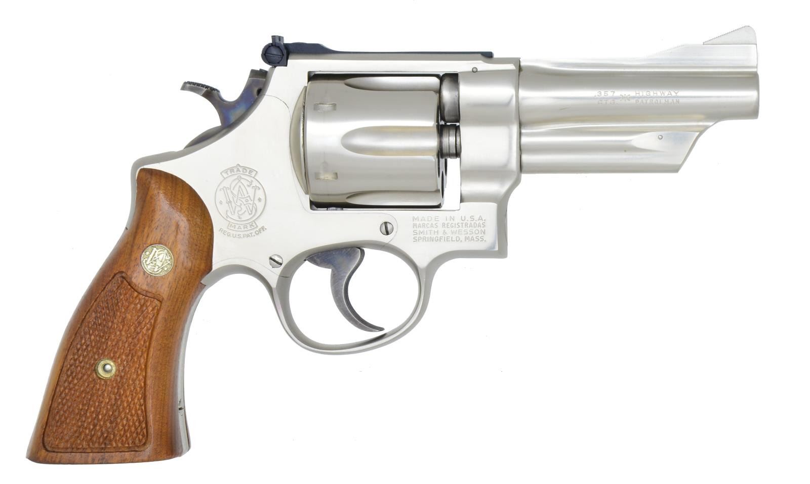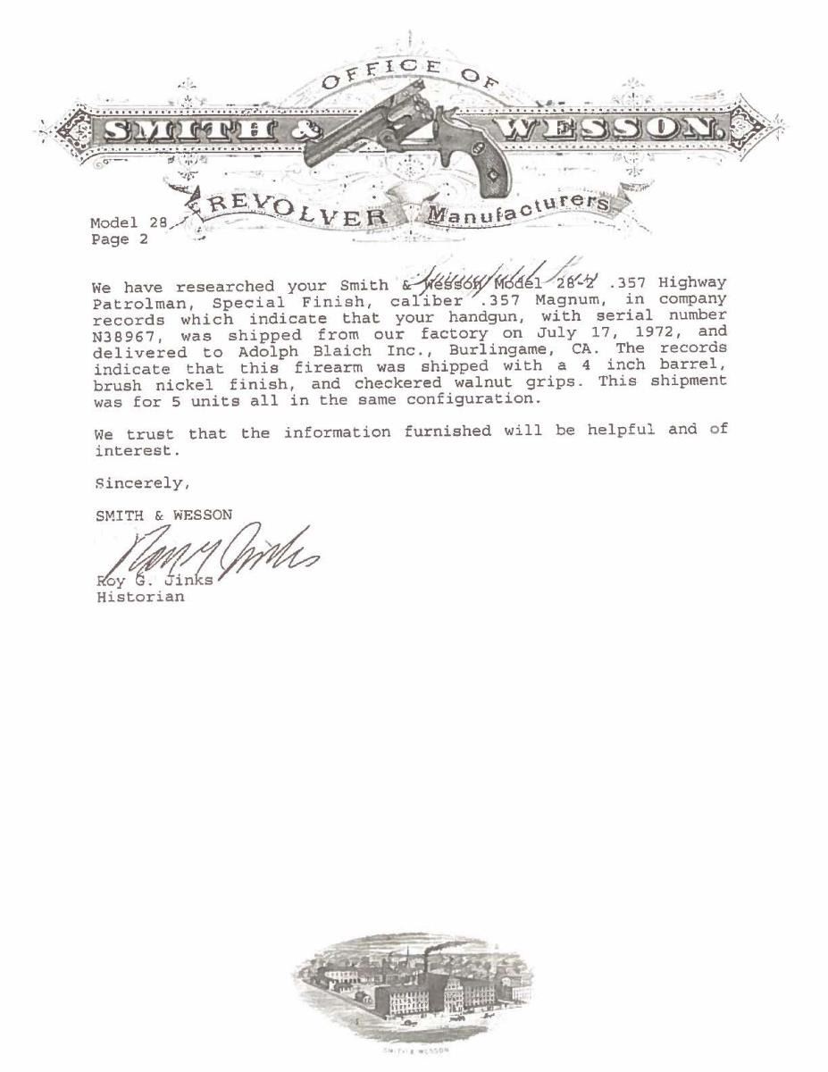NICKEL DA REVOLVER. Cal. 357 Mag. S# N38967 (July 17, 1972). Pinned 4" w/ Baughman front sight & smooth micrometer rear sight. Brush nickel finished, 3 screw,, square butt, N target frame w/ 6 shot fluted swing out cyl. Matching numbered 2 piece border checkered walnut Magna grips w/ S&W medallions. UNATTACHED ACCESSORIES: Nov. 26, 2007 Roy Jinks 2 page letter describing the history of the Model 28 "Highway Patrolman" & the specifications of this revolver including the Brush Nickel "Special Finish", shipped from the factory July 17, 1972. CONDITION: near excellent overall appearance w/ a couple of light marks & minimal pinprick oxidation. Near excellent bore. PROVENANCE: Estate collection of Fred Inganamort. (22-1689/MD) CURIO. $3,000-4,000.