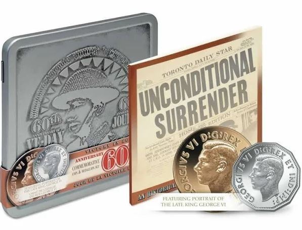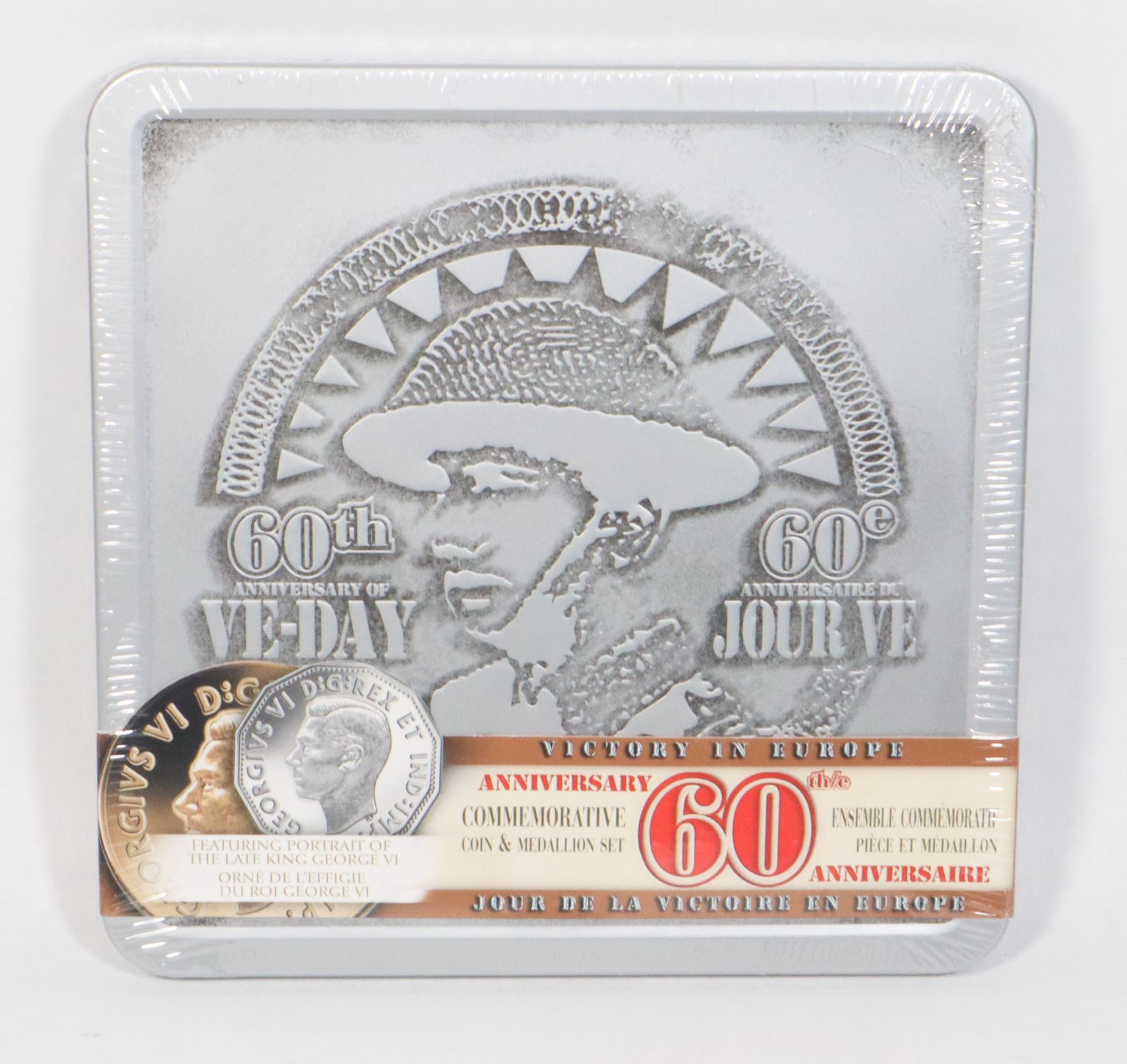 OF VICTORY IN EUROPE COIN AND MEDALLION SET. 2005 ISSUED. INCLUDES STERLING SILVER 5 CENT AND BRONZE MEDAL. PICTURE IS BORROWED FROM COMPANY WEBSITE, YOU ARE BUYING A NEW SEALED SET