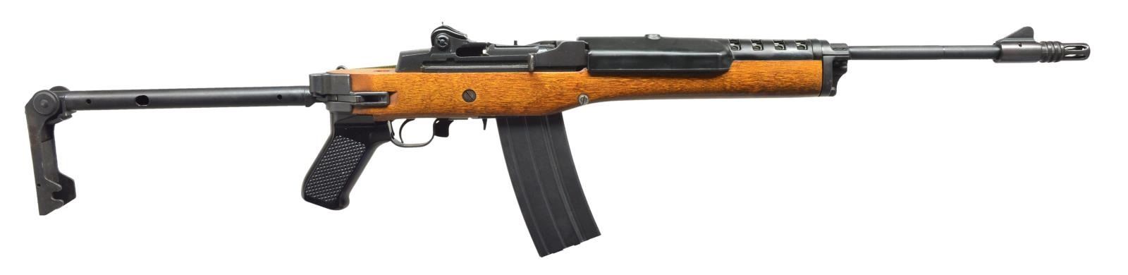 Cal. 223. S# 184-76825. Bbl. 18". The Ruger Mini 14 has earned a reputation as a long standing, reliable rifle w/ several subtle similarities to the war proven M14. Blued bbl. & receiver w/ plastic handguard & hardwood stock. Factory side folding stock w/ correct gas block. Bbl. is terminated w/ aftermarket flash hider pinned through original front sight blade. Effective blade front sight w/ adj. rear peep sight. Sling swivels front & rear w/ appropriate gas block currently sporting green canvas sling. 1985 Mfg. MAGS: 1 factory 30 rd. mag. CONDITION: no extensive apparent blemishing on exterior surfaces w/ only light thinning on surfaces of mechanical intervention. Wood stock appears free of any major blemishing & only exhibits a few light impressions. Bore is shiny w/ strong rifling. Fire control mechanism appears to function correctly when cycled by hand. (21-955/JZ). MODERN. $700-1,100.