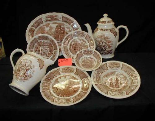 FAIRWINDS BY ALFRED MEAKIN inHISTORICAL SCENES OF CHINESE EXPORT TO AMERICAin (EACH PIECE DEPICTS A DIFFERENT CLIPPERSHIP SCENE) INCLUDES (1) 7 3/8in WATER PITCHER ( W/OLD REPAIRS THIS IS THE ONLY DAMAGED PC. EVERYTHING ELSE HAS NEVER BEEN USED!!!) (1) 10in