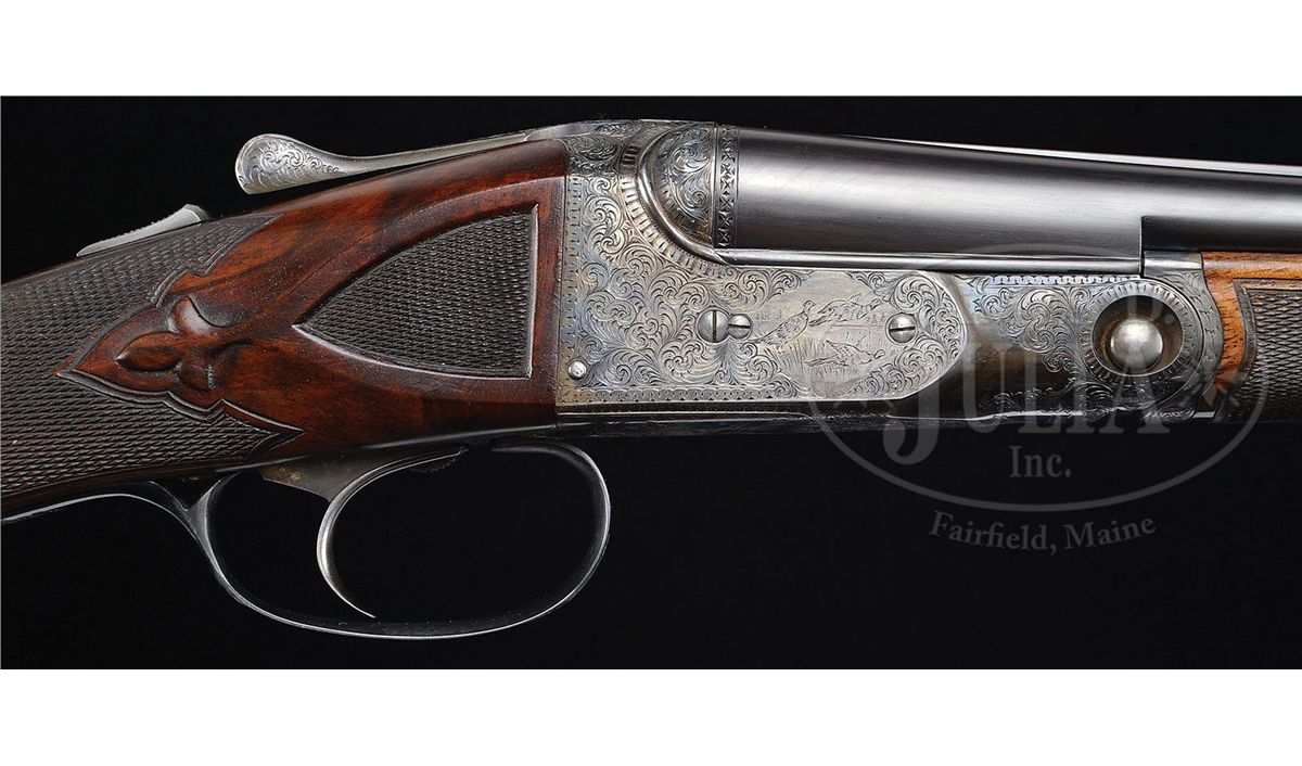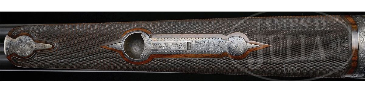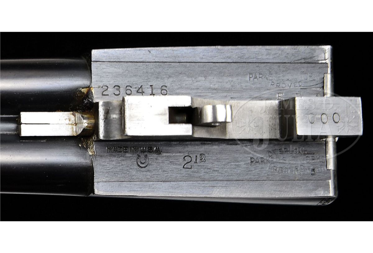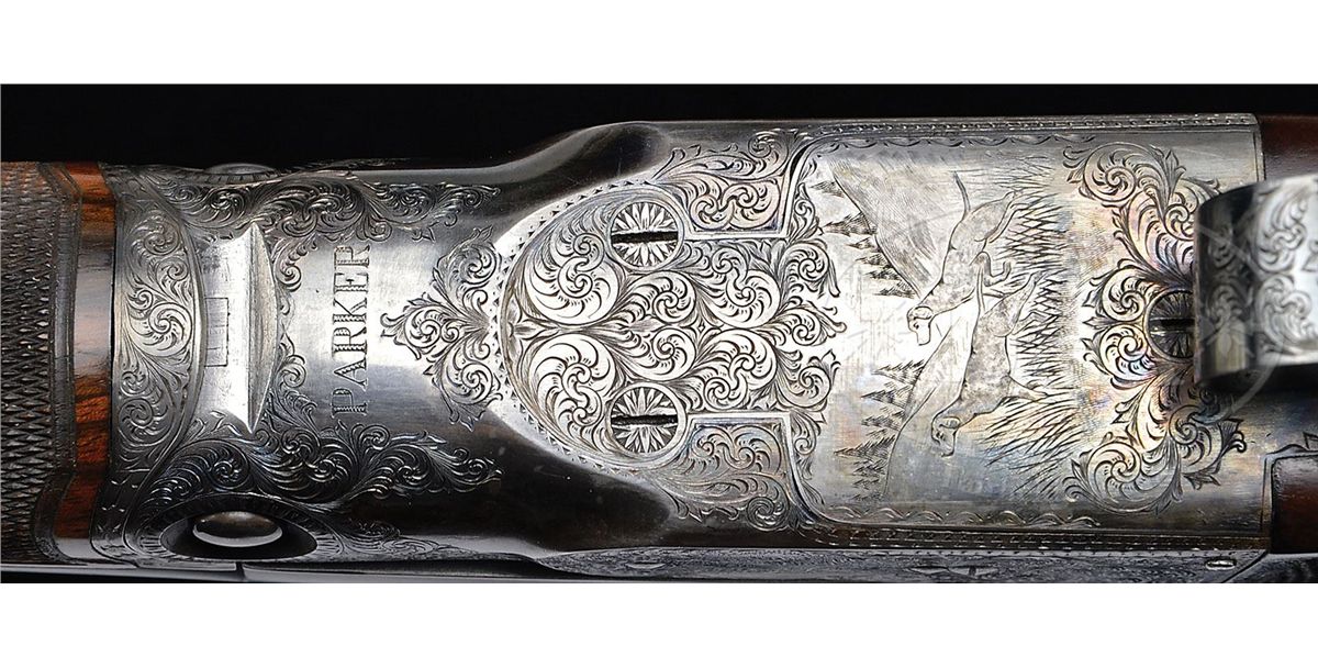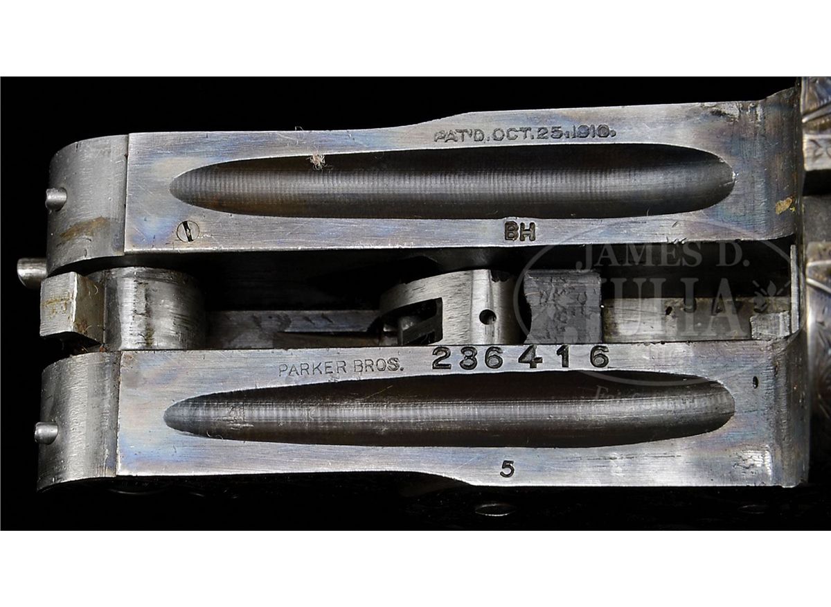SN 236416. Cal. .410. 3" Chambers. 000 Frame. 26" Bbls with unmarked rib, are stamped with Parker proofs, SN, horseshoe, and "Made in USA" on bbl flats. Side of lump is stamped "B Grade .410 GA." Action with non-automatic safety and orig Parker single trigger. has been upgraded by stamping "BH" and "5" on water table, filing in single bead around fences, and engraving with well done scroll, framing game birds; three quail on left, and three pheasants on right side of action. A pair of hunting dogs are in mountainous scene on trigger plate. "Parker" is emblazoned on bottom of action. Nicely veined European walnut straight grip buttstock measures 13-7/8" over skeleton buttplate, and features checkered side panels with fleur-di-lis drop points, correctly shaped "B" type checkering with fancy mullered borders at grip, and vacant gold oval on toe line. Splinter ejector forend is near fully checkered. Bore diameter at muzzles: left-.395, right -.395. Wall thickness: left -.042, right -.038. Drop at heel: 2-1/4", drop at comb: 1-3/8". Weight: 6 lbs. 0 oz. LOP: 13-7/8". CONDITION: Excellent, retaining most of its custom and correctly colored refinishes. This nice handling little gun was obviously someone's favorite, and refinish has backed off so that just enough wear is present that it could easily be mistaken for the real thing. Parker Gun Identification and Serialization ledger indicates that this gun originated as a VHE single trigger gun with straight grip. Stocks show a number of light marks under some added finish. Checkering is slightly worn and dark. Bores are excellent. Action is tight. Ejectors and trigger are excellent. 4-48973 MGM118