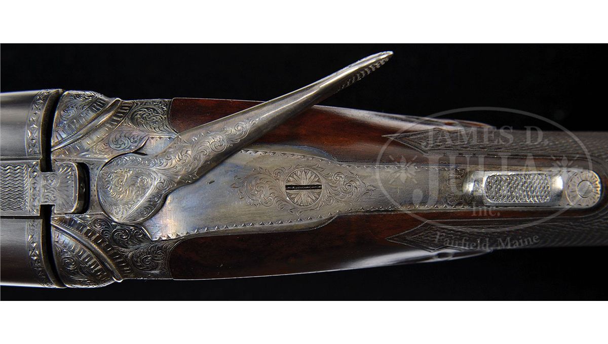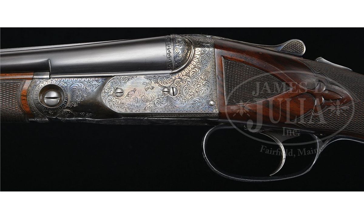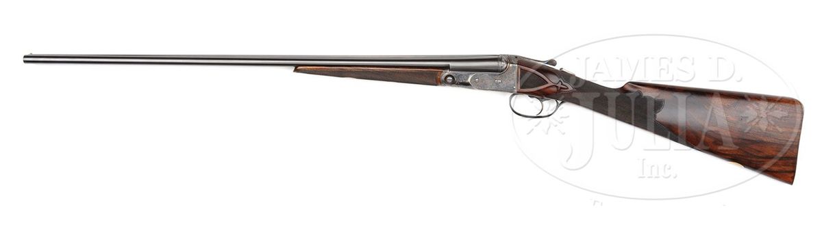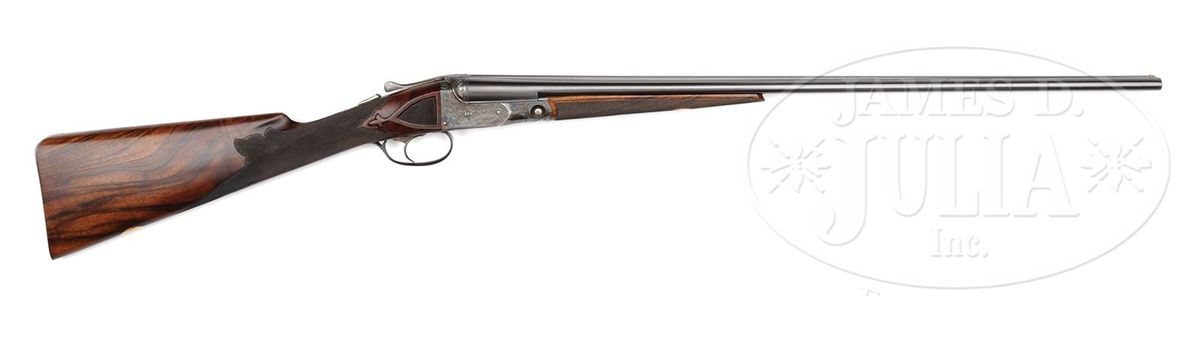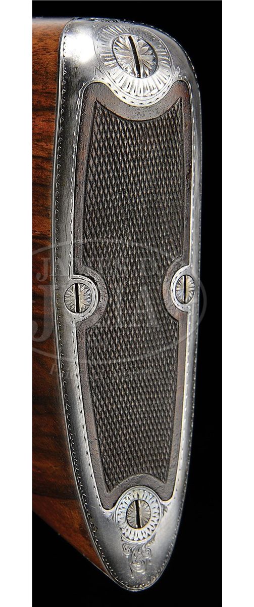 SN 236416. Cal. .410. 3" Chambers. 000 Frame. 26" Bbls with unmarked rib, are stamped with Parker proofs, SN, horseshoe, and "Made in USA" on bbl flats. Side of lump is stamped "B Grade .410 GA." Action with non-automatic safety and orig Parker single trigger. has been upgraded by stamping "BH" and "5" on water table, filing in single bead around fences, and engraving with well done scroll, framing game birds; three quail on left, and three pheasants on right side of action. A pair of hunting dogs are in mountainous scene on trigger plate. "Parker" is emblazoned on bottom of action. Nicely veined European walnut straight grip buttstock measures 13-7/8" over skeleton buttplate, and features checkered side panels with fleur-di-lis drop points, correctly shaped "B" type checkering with fancy mullered borders at grip, and vacant gold oval on toe line. Splinter ejector forend is near fully checkered. Bore diameter at muzzles: left-.395, right -.395. Wall thickness: left -.042, right -.038. Drop at heel: 2-1/4", drop at comb: 1-3/8". Weight: 6 lbs. 0 oz. LOP: 13-7/8". CONDITION: Excellent, retaining most of its custom and correctly colored refinishes. This nice handling little gun was obviously someone's favorite, and refinish has backed off so that just enough wear is present that it could easily be mistaken for the real thing. Parker Gun Identification and Serialization ledger indicates that this gun originated as a VHE single trigger gun with straight grip. Stocks show a number of light marks under some added finish. Checkering is slightly worn and dark. Bores are excellent. Action is tight. Ejectors and trigger are excellent. 4-48973 MGM118