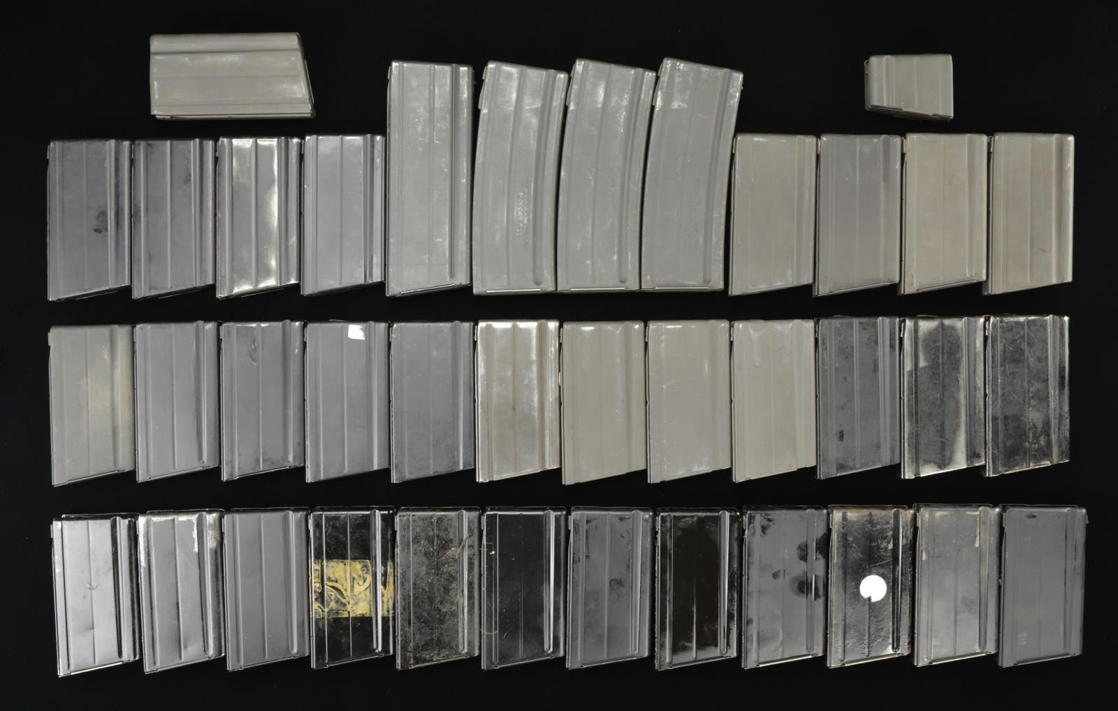 METRIC - Parkerized; 1 - 5 rd., 7 - 20 rd., 3 curved 30 rd., 1 straight 30 rd. / 9 Blued - 20 rd. / INCH (all 20 rd.) 3 parkerized. 13 blued. CONDITION: good to near excellent. (02-16810-7/NW). $450-600.