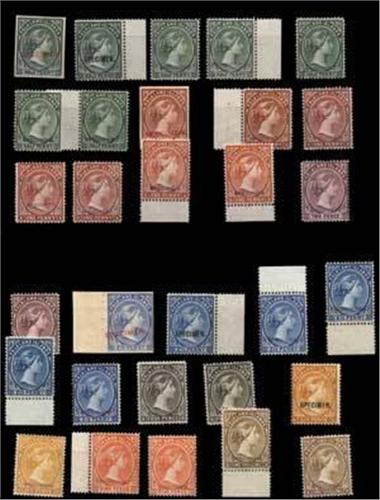Specimens: Set of thirty of the 1891-1902 Bradbury Wilkinson Specimens from the printers archive, lovely fresh colours ideal for reference, only one sheet of sixty of nearly every value/printing was retained in the archive and were overprinted SPECIMEN in