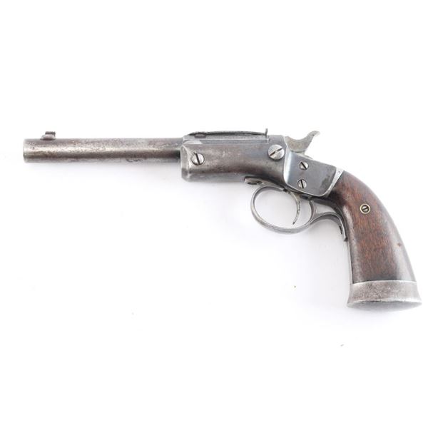 Single shot tip up pistol chambered in .22LR with part octagon/ round 6" BBL. Circa 1907-16. Fixed bead post front sight and rear adjustable &q...