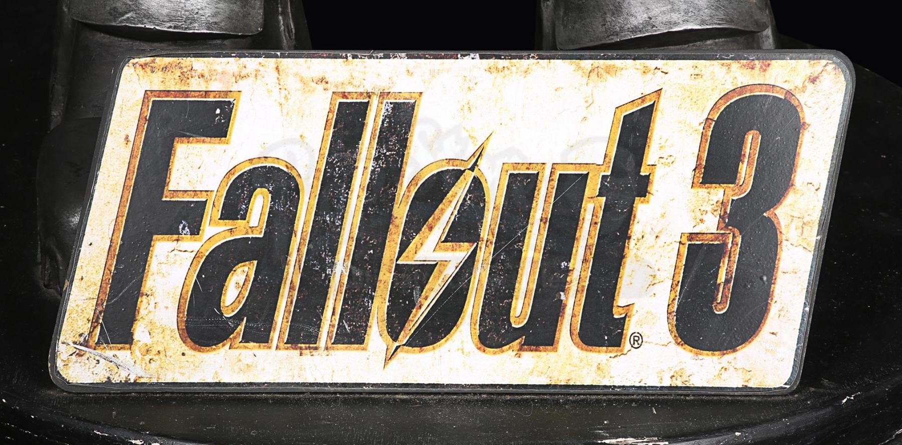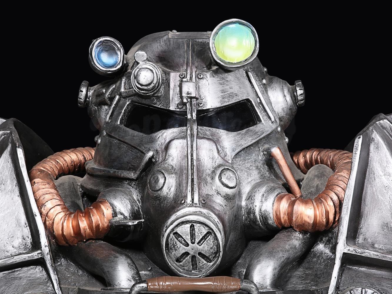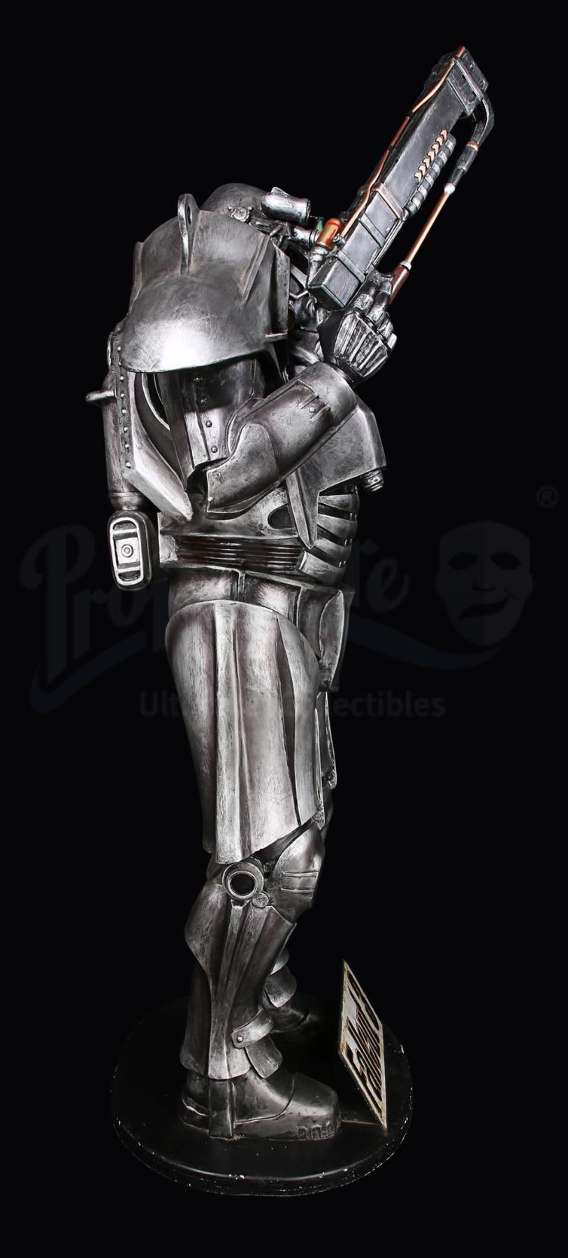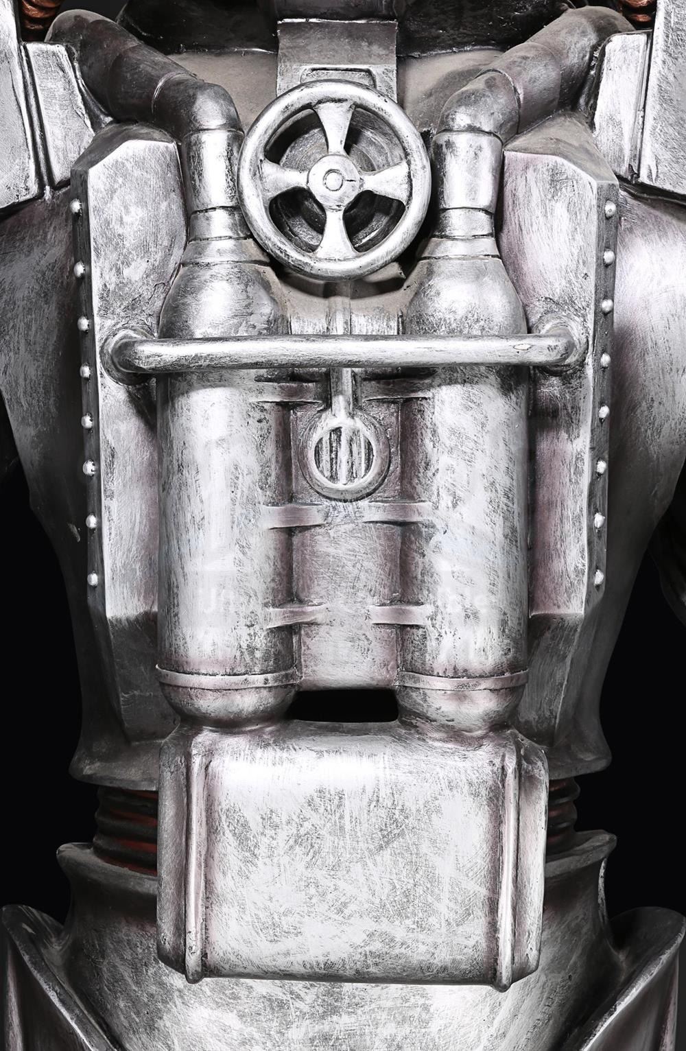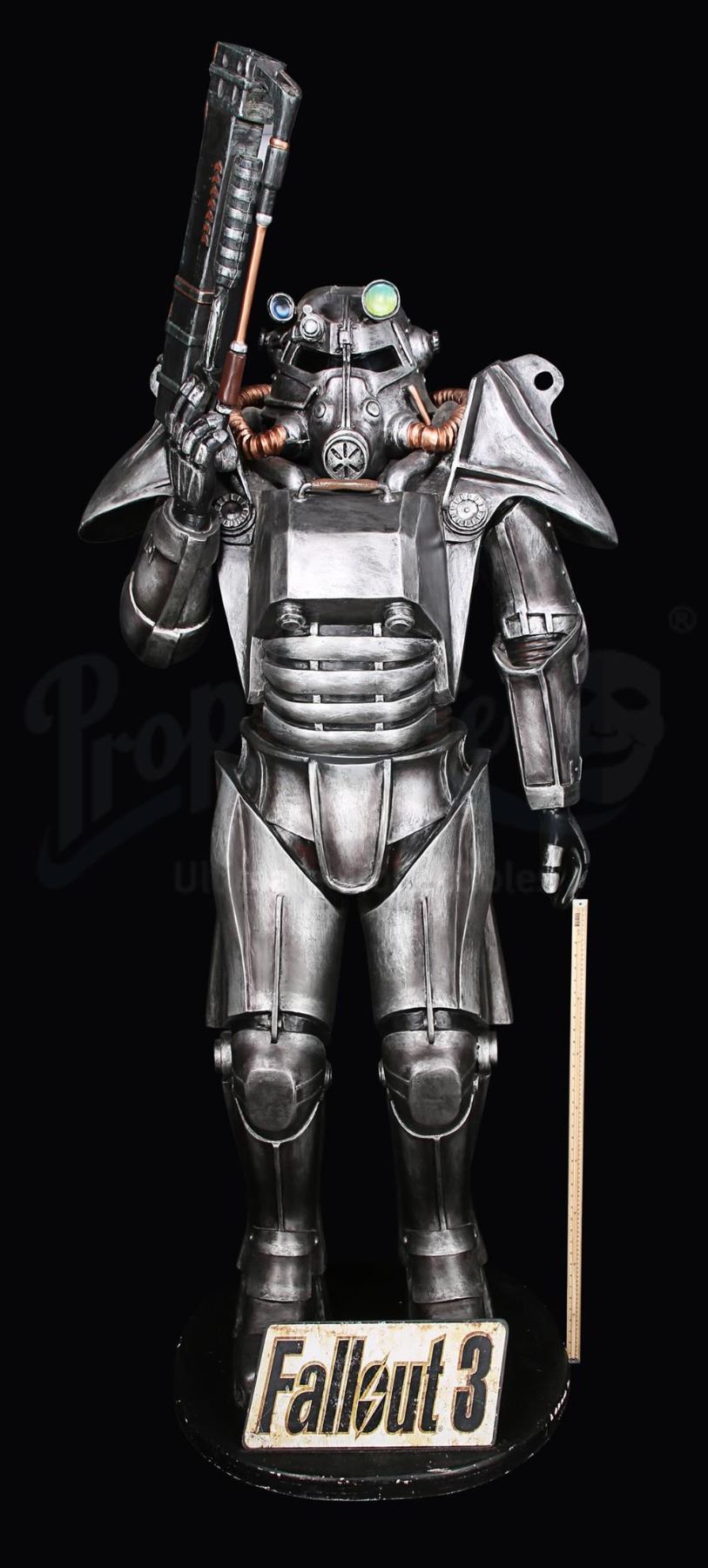 A statue of T-45 Power Armour created to promote the 2008 release of the post-apocalyptic video game Fallout 3. Power armour was used predominantly by members of the Brotherhood of Steel in the game. 94.5" high. Made from fibreglass and intentionally distressed. Arm with blaster is detachable and the statue is displayed on a base with a Fallout 3 plaque on the front.
