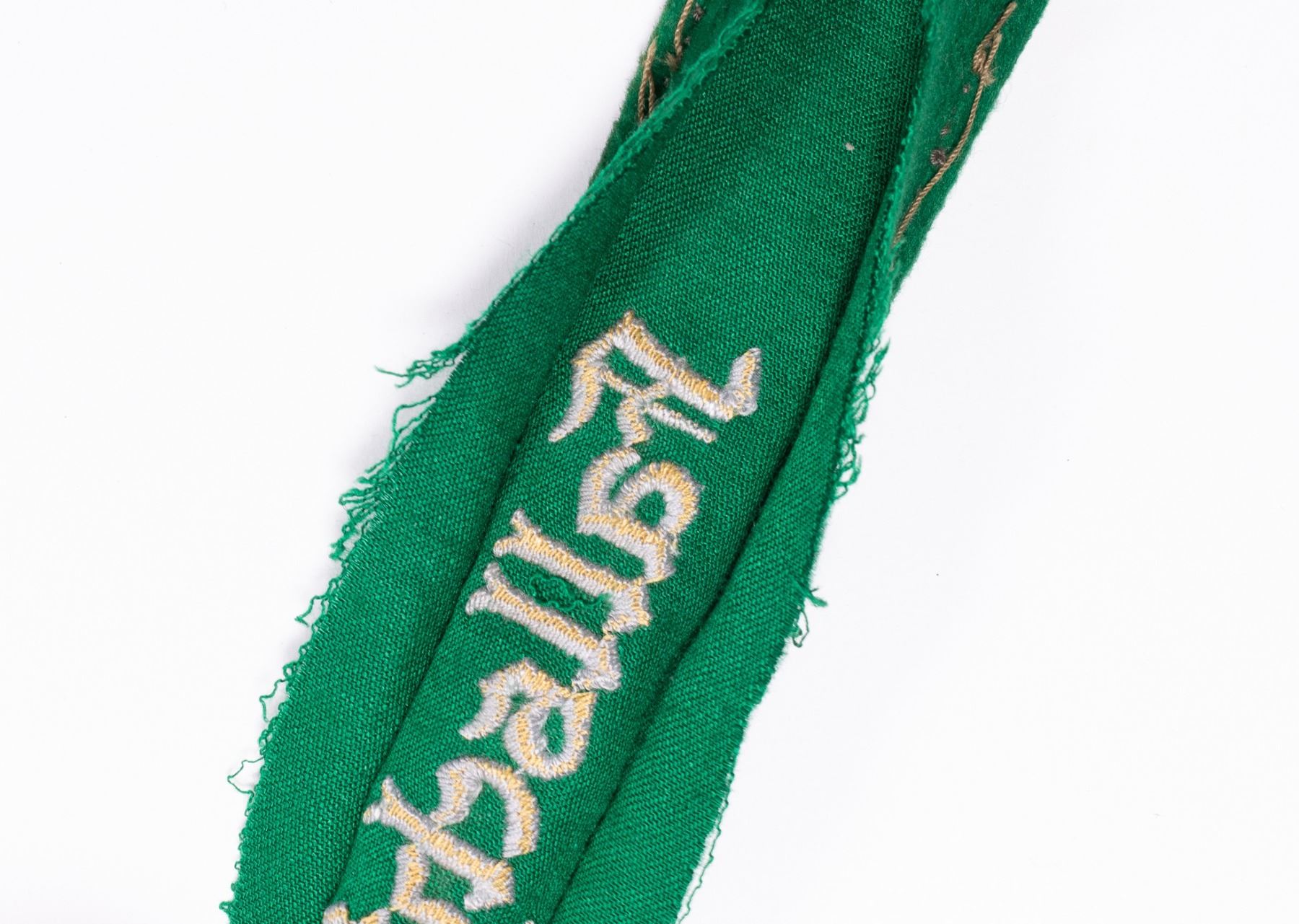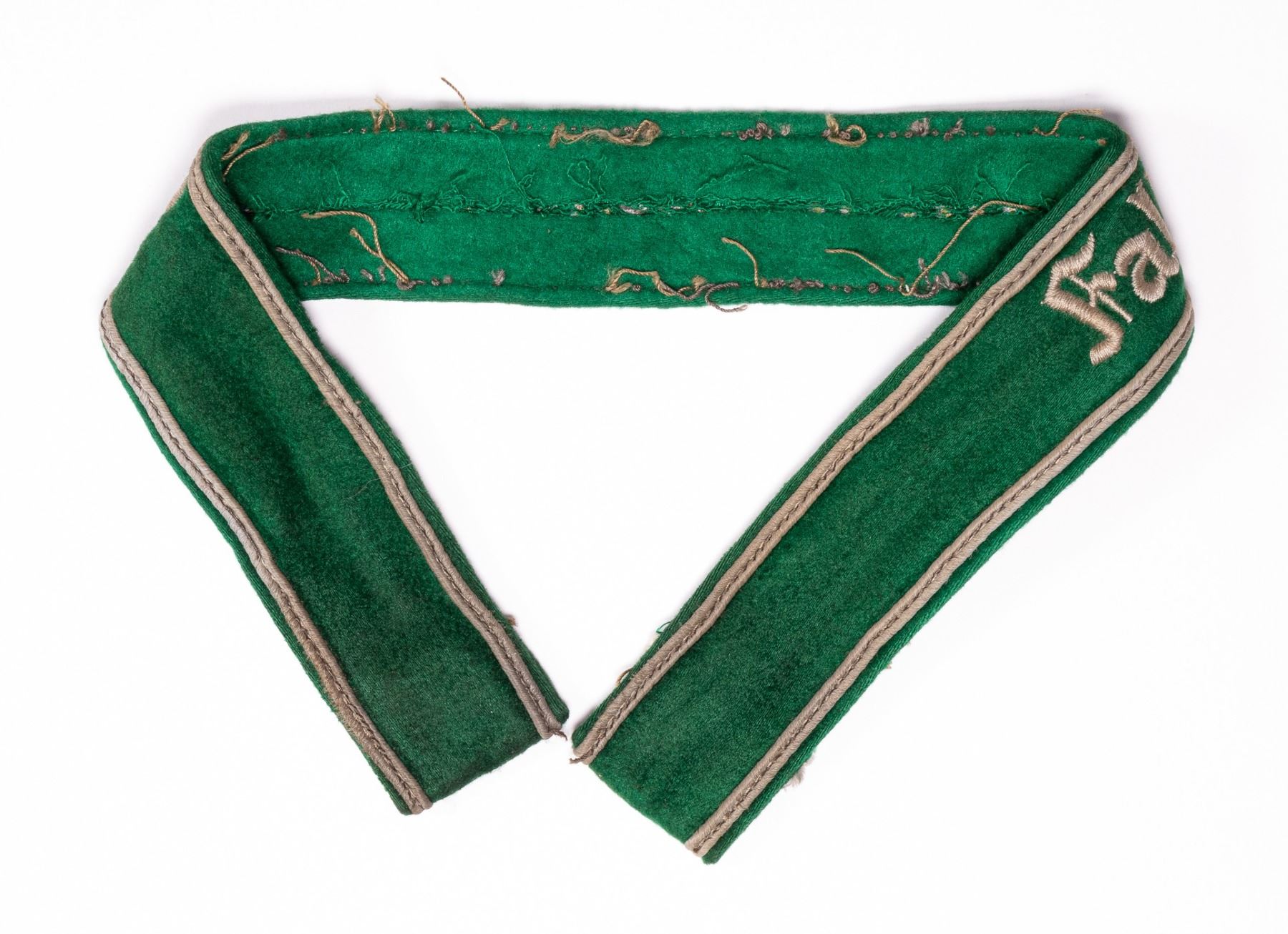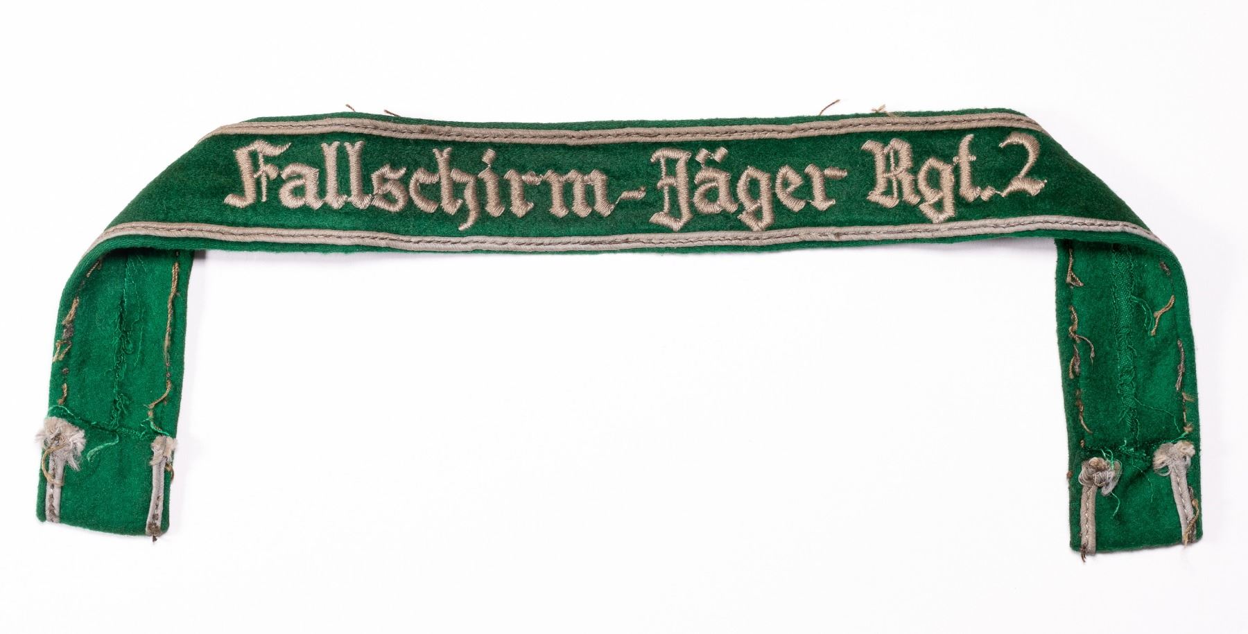 Fallschirm-Jager Regiment 2 cufftitle on green wool backing with silver trim, approx. 15.5 x 1 inches.