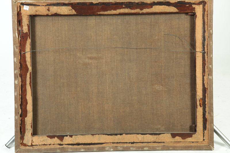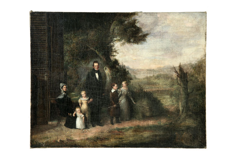 Oil on canvas, unsigned. Well-dressed family of six in front of their house with a panoramic view of the frontier landscape in the background. Restoration. Unframed, 25"h. 32"w.