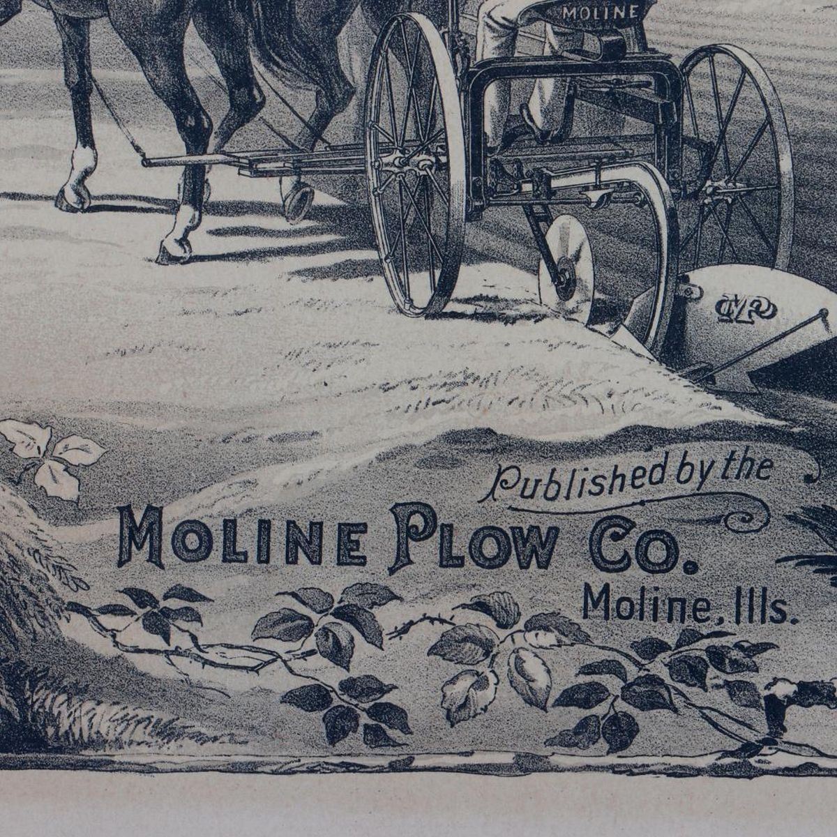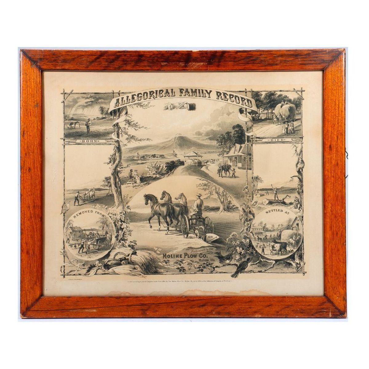 "Allegorical Family Record," Published by the Moline Plow Co., Moline, Illinois, 1881. By Gies & Co. Lith. Buffalo, NY. A print with illustrations of rural farm scenes, divided into sections for filling in family history. 16in. x 19 7/8in.; 18 1/2in. x 22 1/2in. (vintage frame). Condition: Toning, dampstaining along the bottom border.