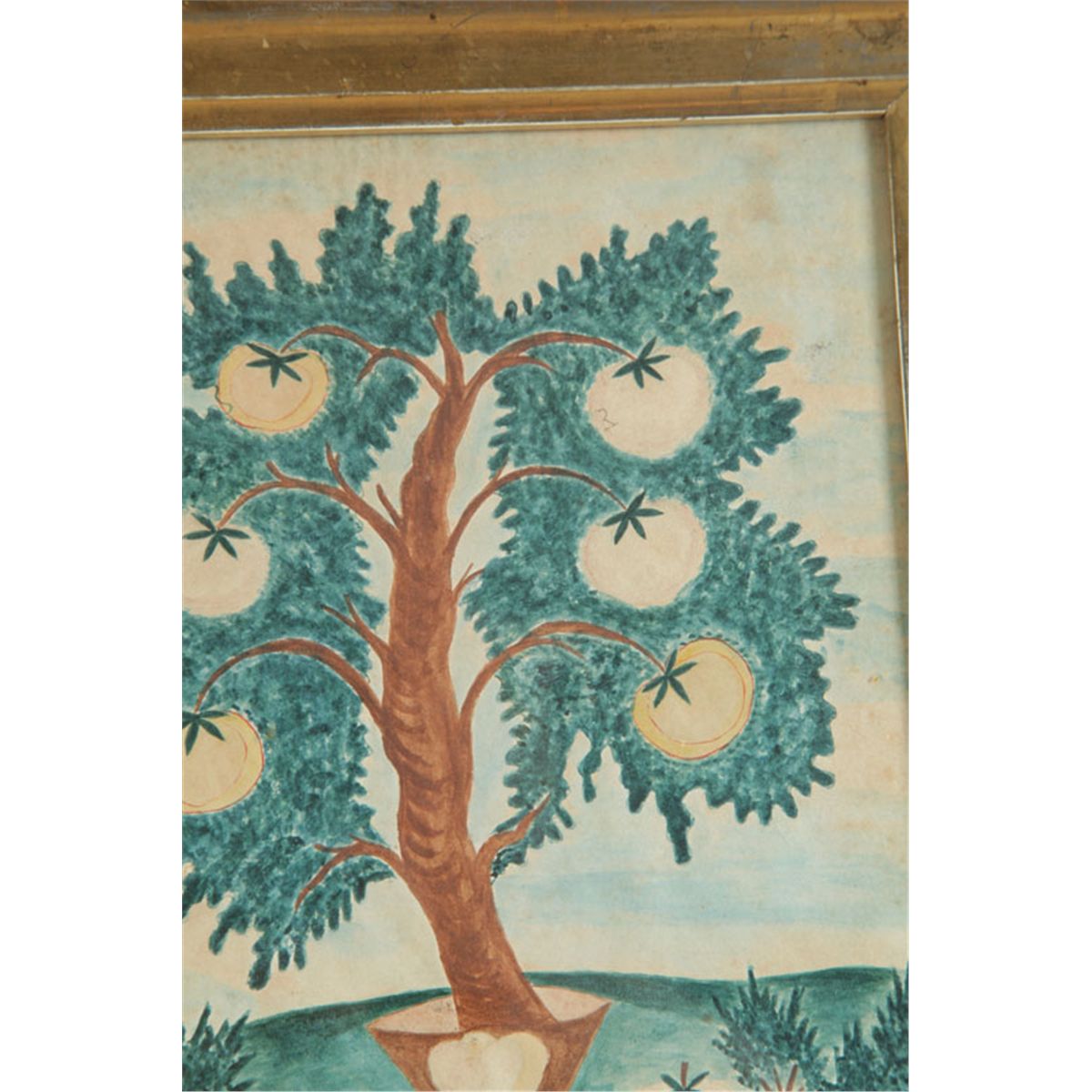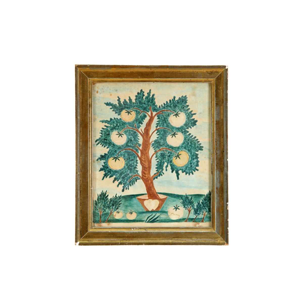 Possibly William Richardson, New England, early 19th century, watercolor on paper. Never-used record depicting a tree with fruit. Light stains. Period gilt frame, 10 1/2"h. 9"w. Ex Stewart Gregory, sold at Sotheby's (New York), January 1979, lot 83.