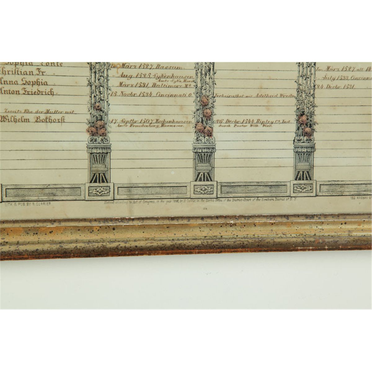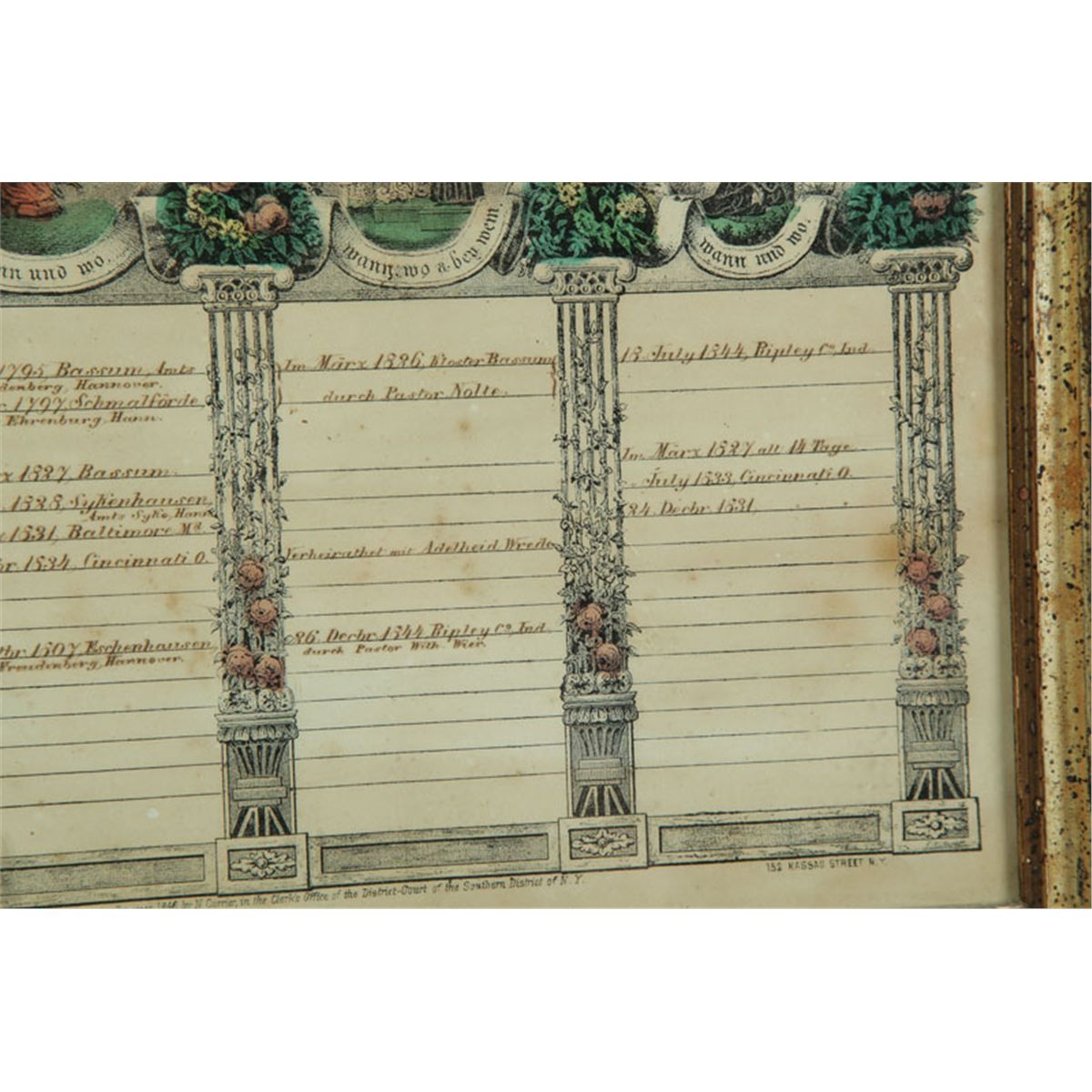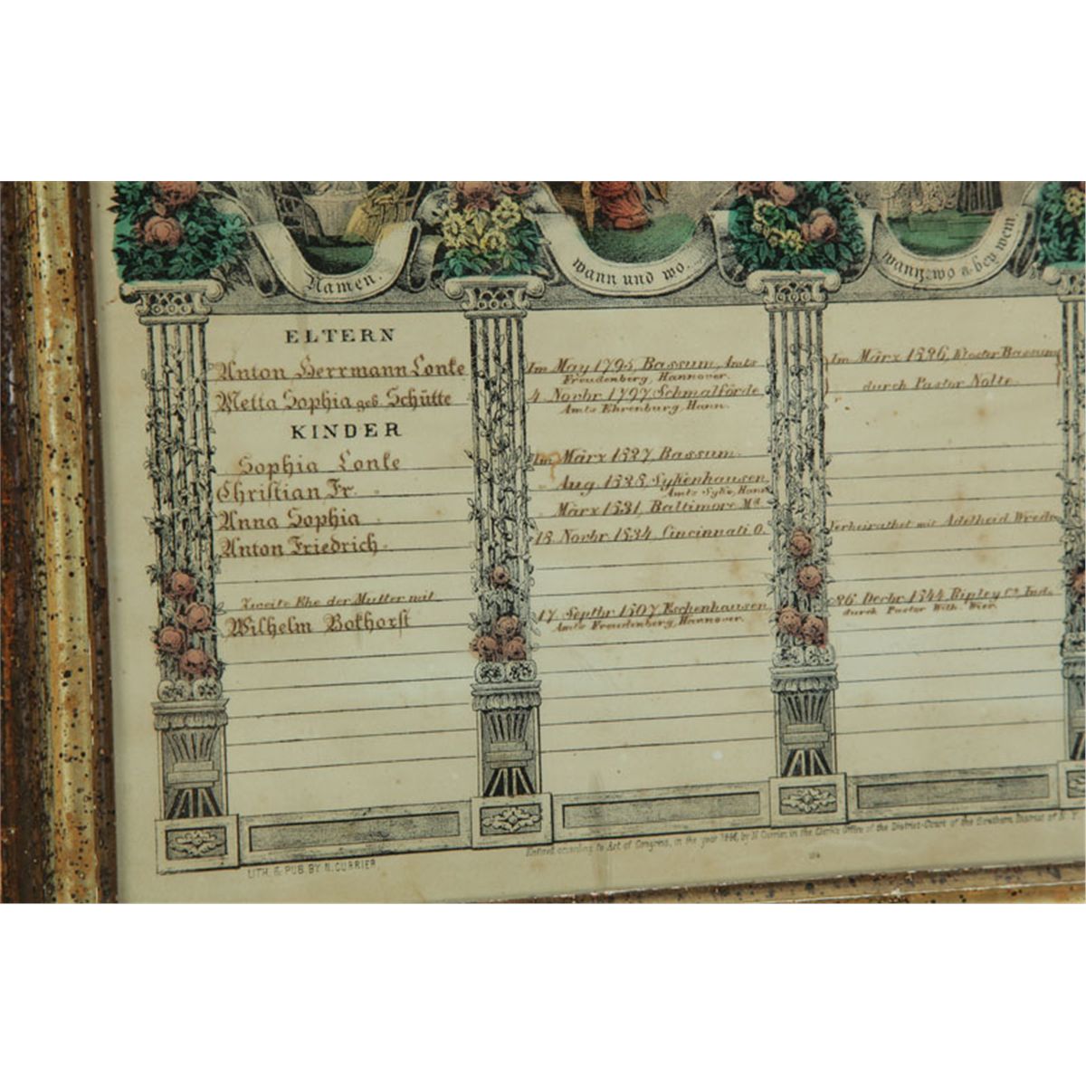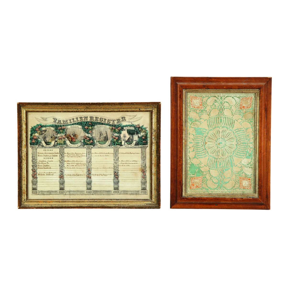 Register printed by Currier in 1846, German language. Conte and Schutte families, Cincinnati. Period gilt frame, 11 3/4"h. 15 1/2"w. And a paper cutout framed against green and orange paper. Period frame, 12"h. 15 3/4"w.