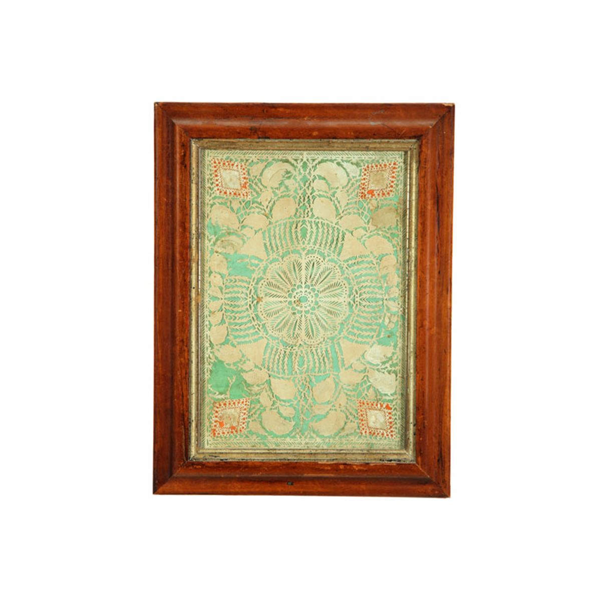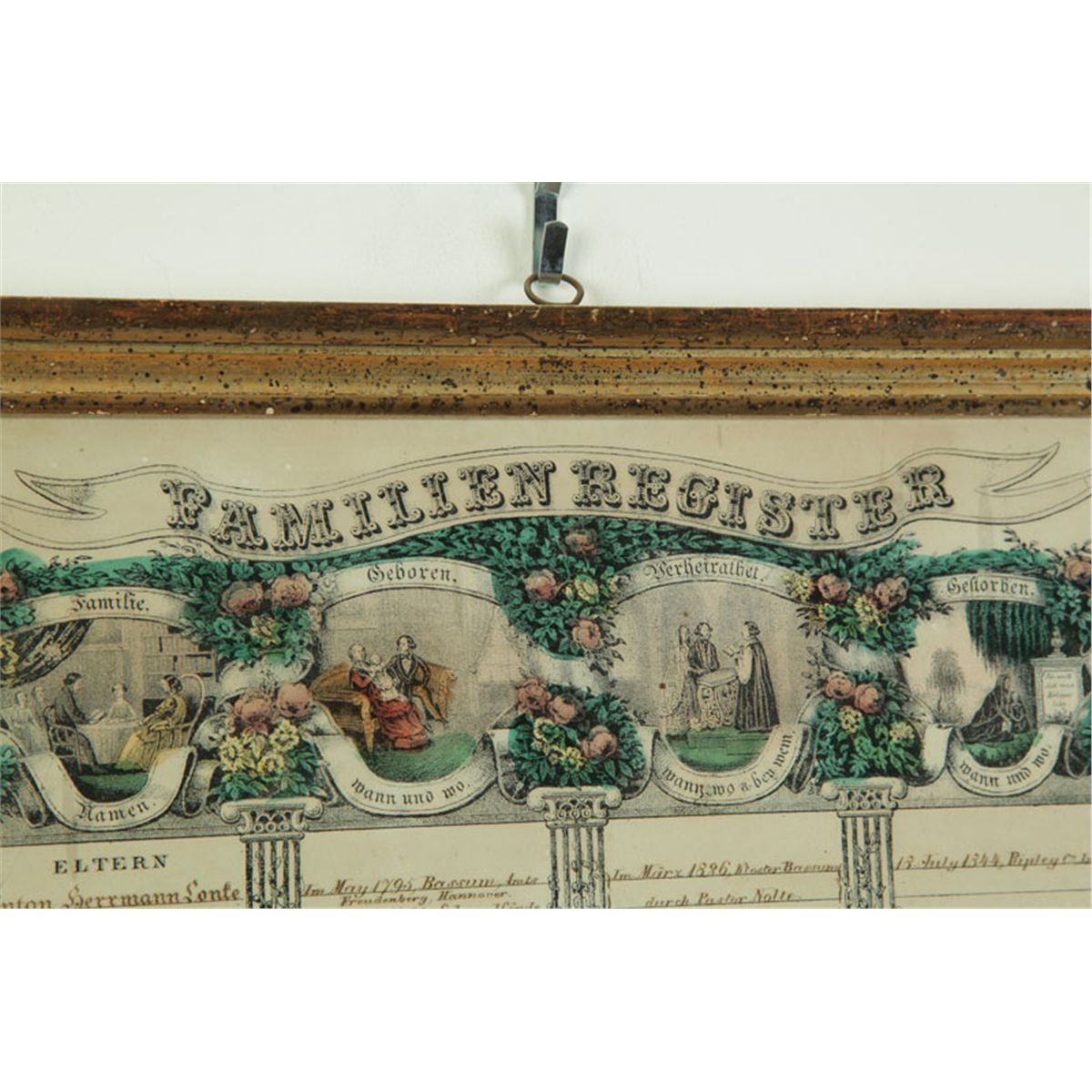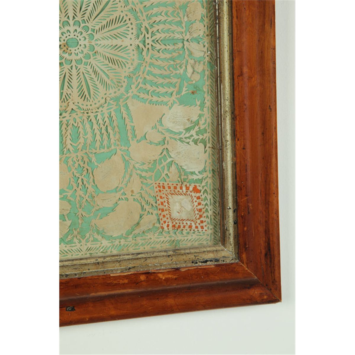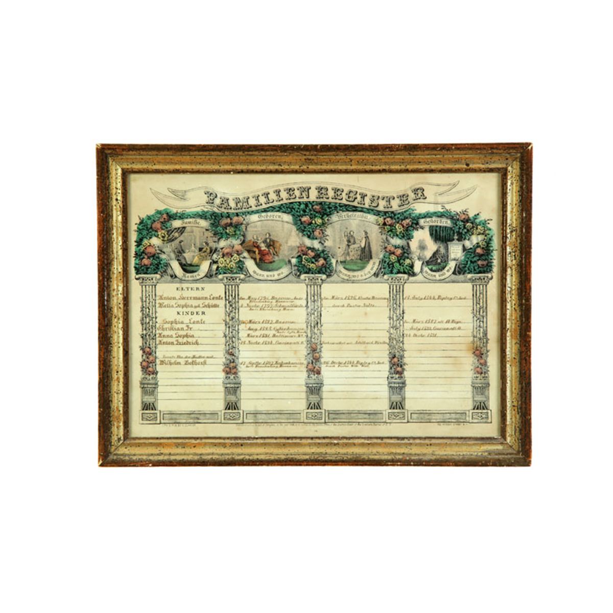 Register printed by Currier in 1846, German language. Conte and Schutte families, Cincinnati. Period gilt frame, 11 3/4"h. 15 1/2"w. And a paper cutout framed against green and orange paper. Period frame, 12"h. 15 3/4"w.