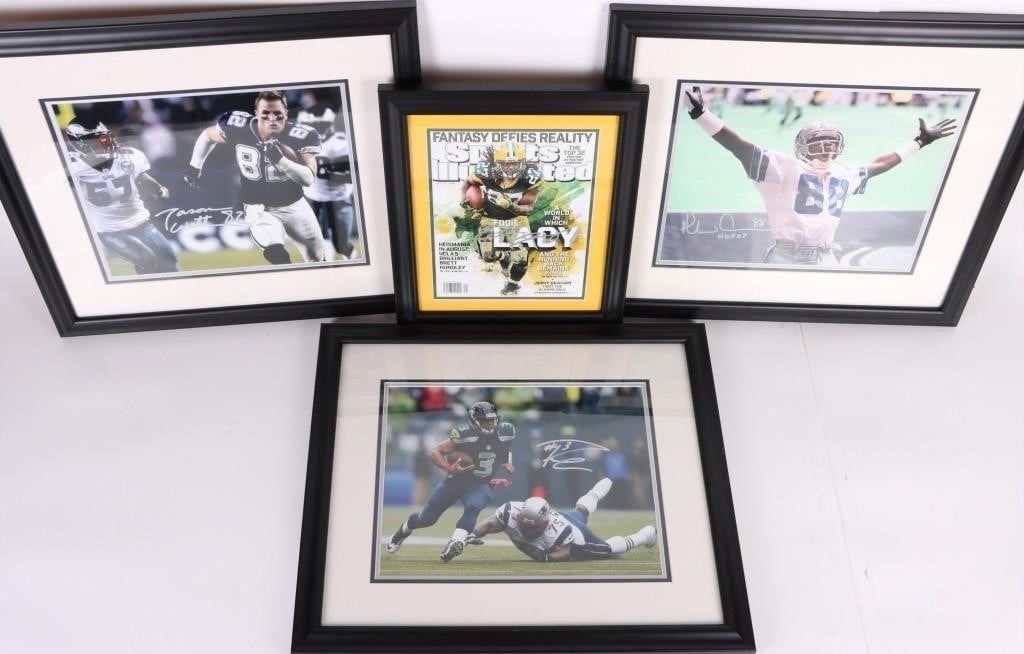 Famous football autographed photos and magazine to include one Eddie Lacy autographed magazine, one Michael Irvin autographed photo Dallas Cowboys, one Russell Wilson autographed photo Seattle Seahawks, and one Jason Witten autographed photo Dallas Cowboys. All autographs are in frames.