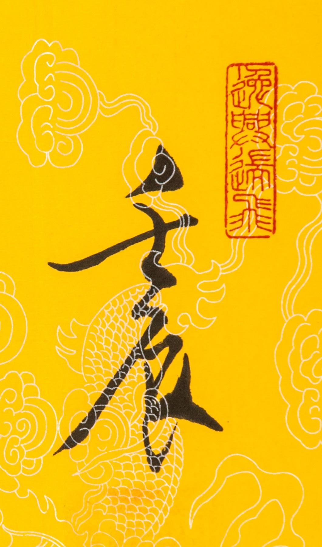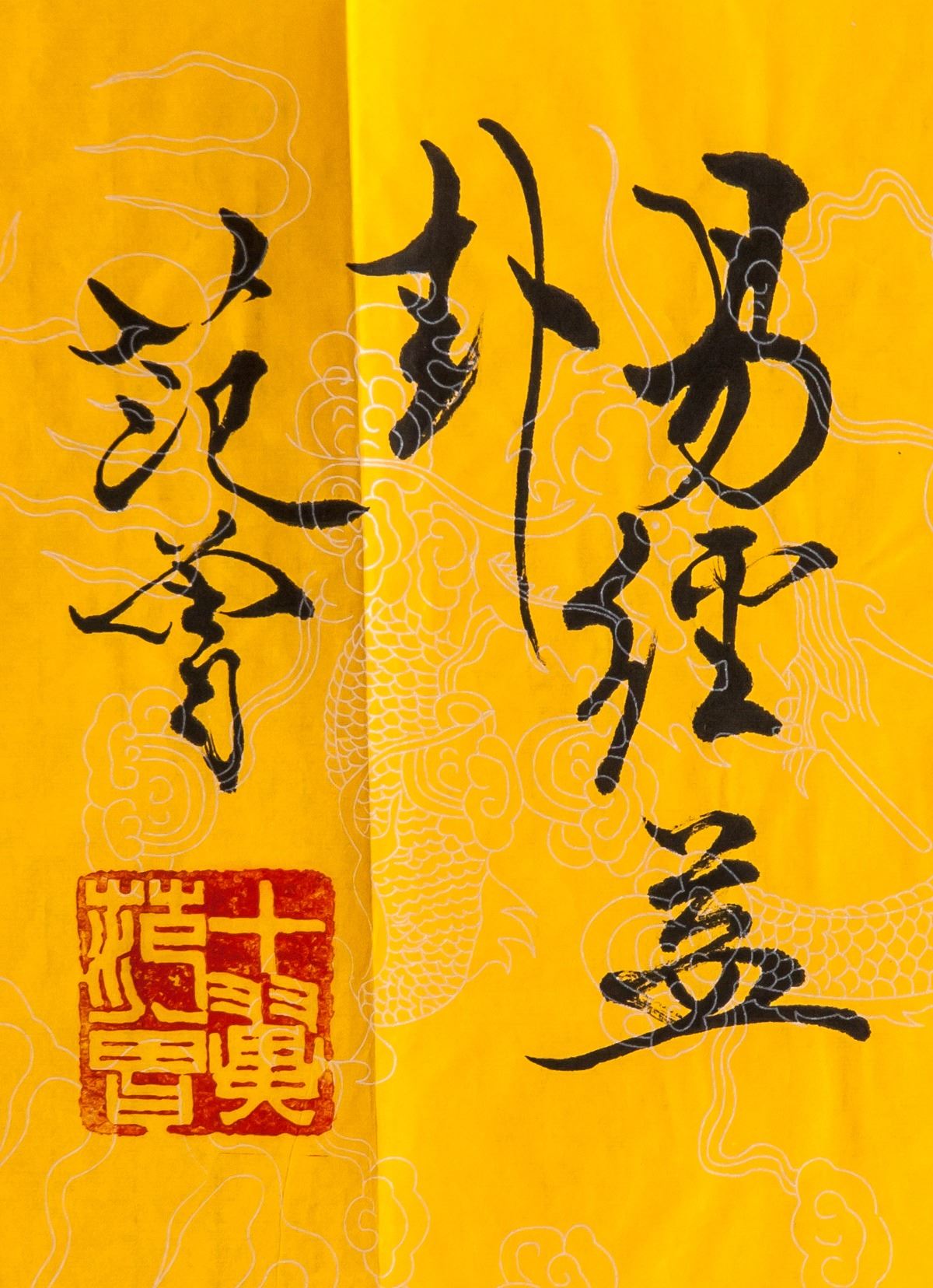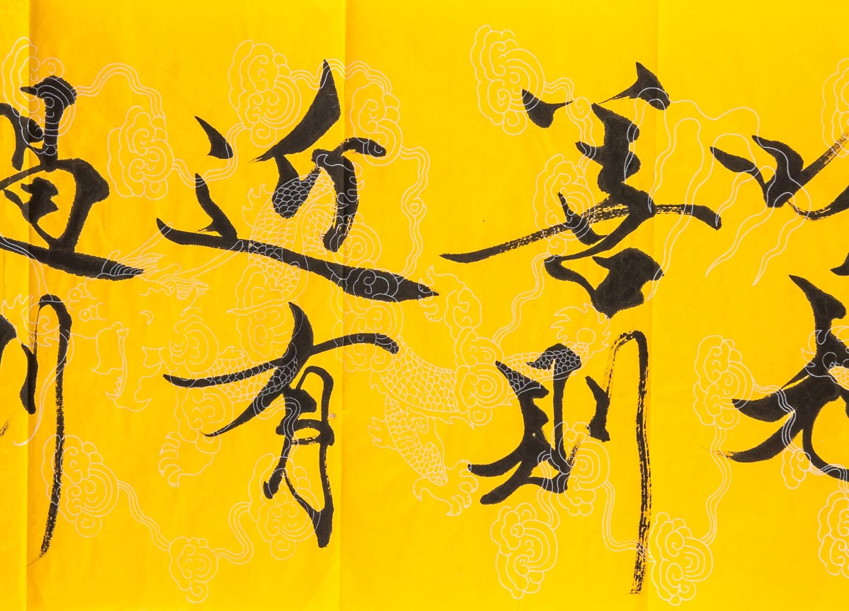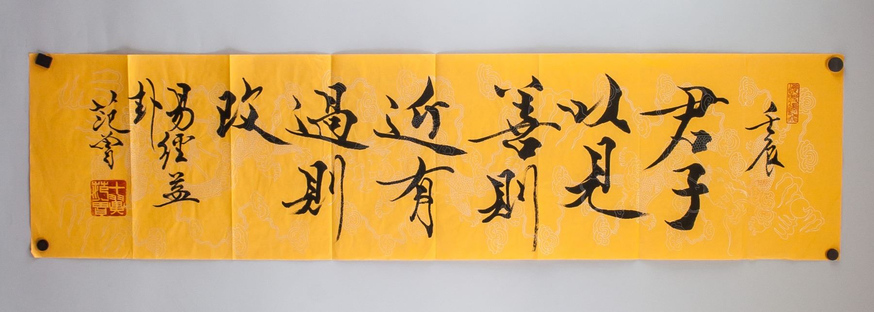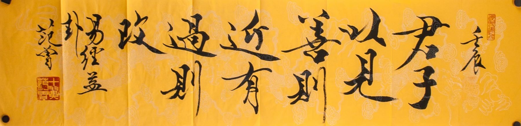 Ink on yellow paper, featuring Chinese calligraphy in semi-cursive script, signed and attributed to Fan Zeng (Chinese, b.1938), inscribed with 2 artist seals, 34.5 x 126 cm, Fan Zeng is contemporary Chinese artist known for his mastery of traditional Chinese painting techniques. His works fuse elements of landscape, flower-and-bird, and figure painting, as well as forms of poetry and calligraphy. He held solo exhibitions in Japan throughout the 1980s, and participated in various exhibitions in Asia. In addition, he has received numerous awards in design and painting.