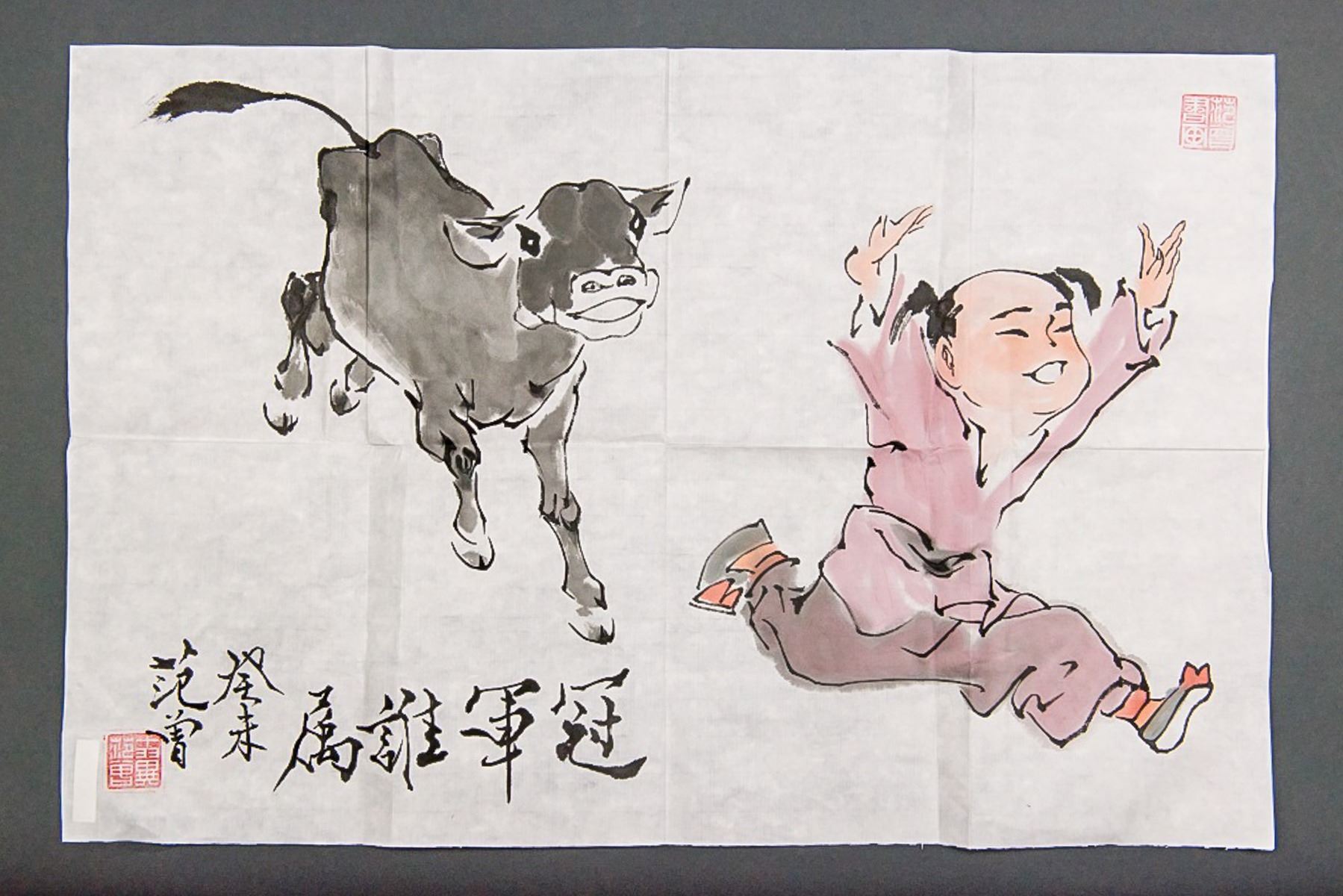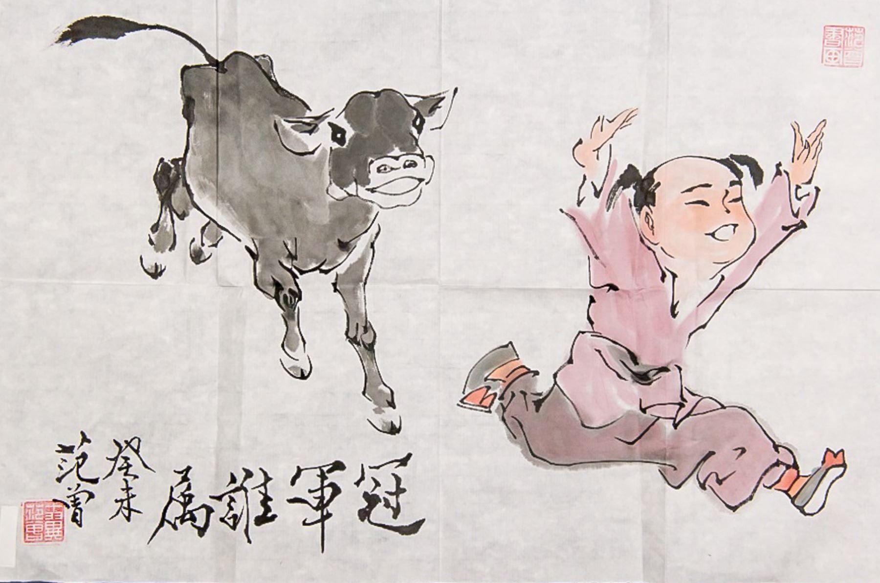 Ink and watercolour on paper. Featuring child and cow. Signed and attr. Fan Zeng (Chinese, b.1938) and inscribed with seal. 43 x 66 cm.