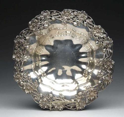 FANCY CENTER BOWL MARKED “J.E. CALDWELL & CO”. Pierced floral decorated border in relief flowers. Bottom marked “3894M Sterling”. WEIGHT: 19 tr. oz. SIZE: 12” dia x 2-1/2” h. CONDITION: Very good. 9-27537