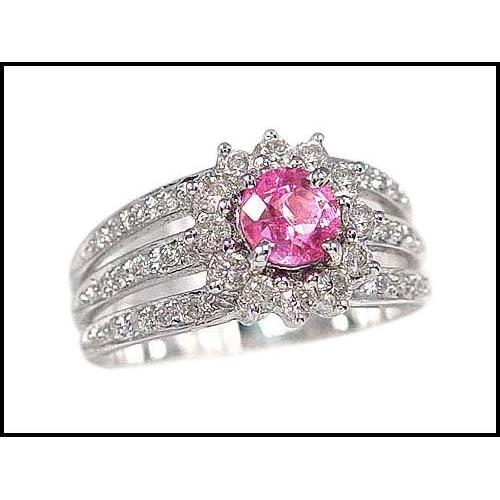 High brilliance is exhibited in this rare,hot pink color natural sapphire weighing .50 carats. The 18K white gold ring is set with 36 full cut diamonds that create superb color contrast for the sapphire. A gem collector's dream come true, at an amazing price as well. Price was $1250. Size 5 3/4. It measures 11mm (7/16") wide. Weighs 5.7 grams.