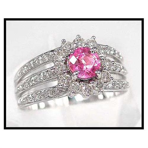 High brilliance is exhibited in this rare,hot pink color natural sapphire weighing .50 carats. The 18K white gold ring is set with 36 full cut diamonds that create superb color contrast for the sapphire. A gem collector's dream come true, at an amazing price as well. Price was $1250. Size 5 3/4. It measures 11mm (7/16") wide. Weighs 5.7 grams.