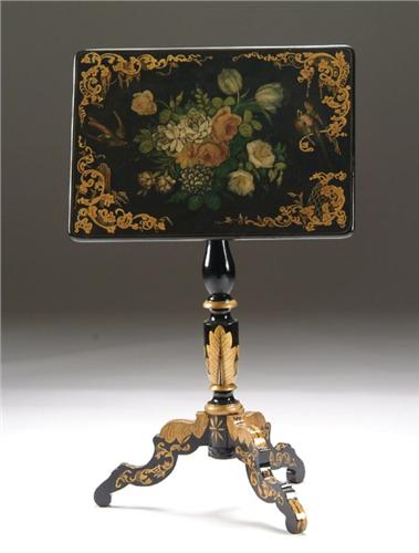 FANCY DECORATED TILT TOP STAND. The black lacquered rectangular top stand has large bouquet of colorful flowers, two birds, and elegant gold leaf scrolls to top. Continuing the gold decoration on black background through central posts and three shaped legs. SIZE: 26in. h x top is 20in. x 14-1/2in.. CONDITION: Very good. 9-26184